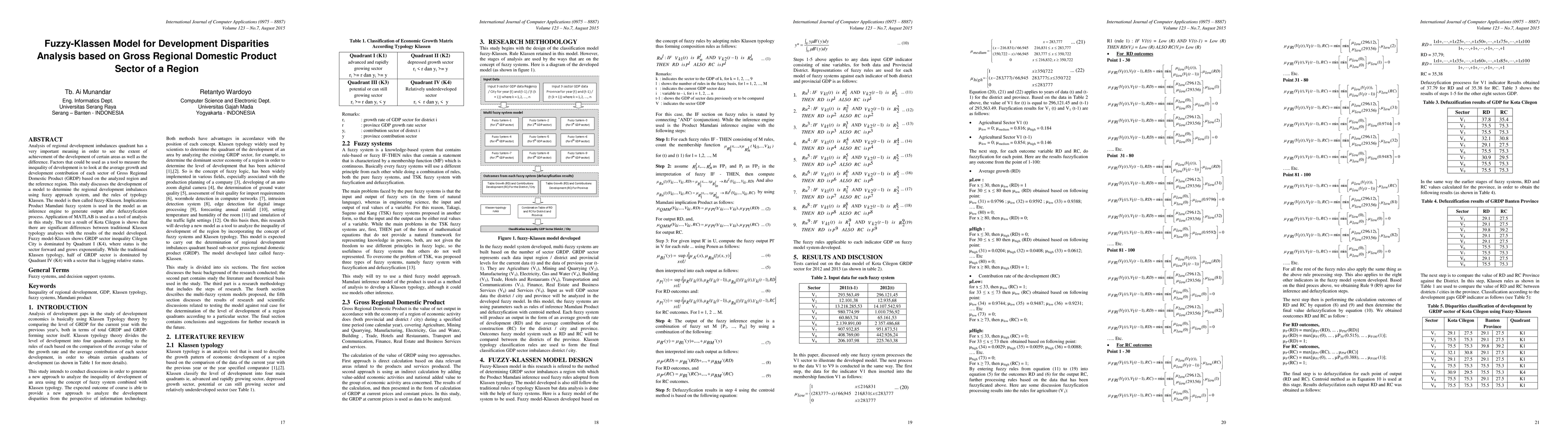 Analysis of regional development imbalances quadrant has a very important meaning in order to see the extent of achievement of the development of certain areas as well as the difference. Factors that could be used as a tool to measure the inequality of development is to look at the average growth and development contribution of each sector of Gross Regional Domestic Product (GRDP) based on the analyzed region and the reference region. This study discusses the development of a model to determine the regional development imbalances using fuzzy approach system, and the rules of typology Klassen. The model is then called fuzzy-Klassen. Implications Product Mamdani fuzzy system is used in the model as an inference engine to generate output after defuzzyfication process. Application of MATLAB is used as a tool of analysis in this study. The test a result of Kota Cilegon is shows that there are significant differences between traditional Klassen typology analyses with the results of the model developed. Fuzzy model-Klassen shows GRDP sector inequality Cilegon City is dominated by Quadrant I (K4), where status is the sector forward and grows exponentially. While the traditional Klassen typology, half of GRDP sector is dominated by Quadrant IV (K4) with a sector that is lagging relative status.