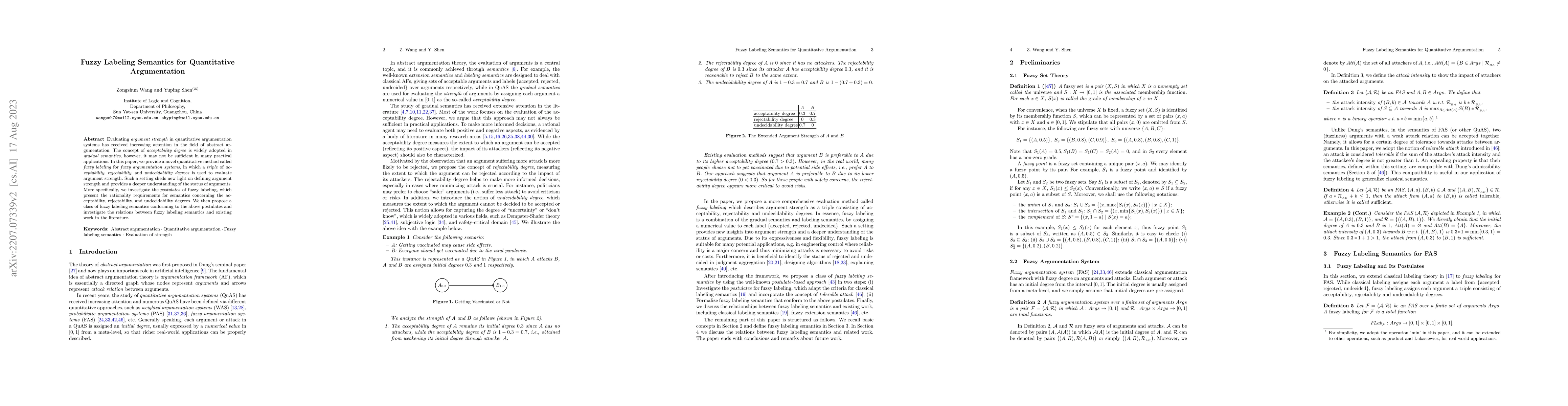 This paper introduces a novel fuzzy labeling method for evaluating argument strength in quantitative argumentation, using triples of acceptability, rejectability, and undecidability degrees. It proposes a class of fuzzy labeling semantics that adheres to rationality postulates and explores its relationship with existing approaches in the field.