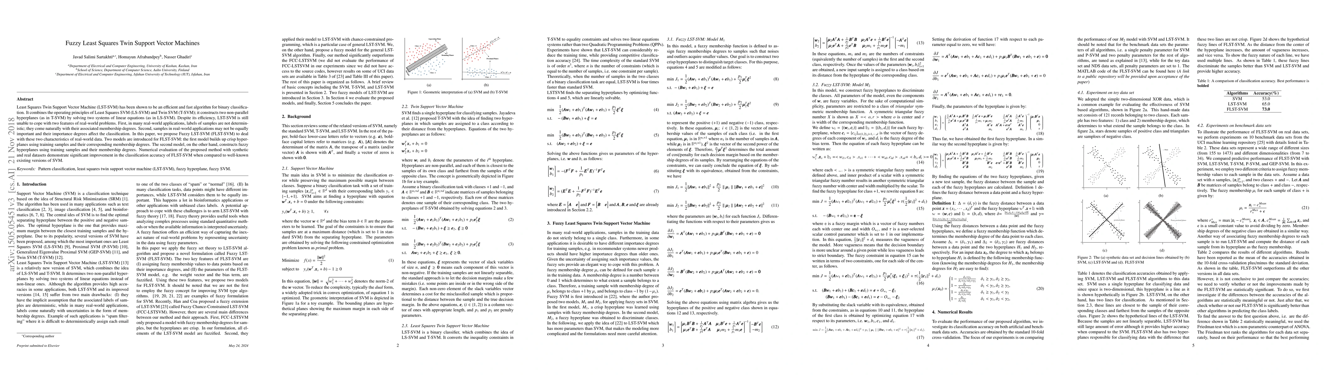 This paper proposes Fuzzy Least Squares Twin Support Vector Machines (FLST-SVM) to enhance binary classification by addressing the non-deterministic labels and varying importance of samples in real-world data. The method introduces two models: one for crisp hyperplanes and another for fuzzy hyperplanes, showing improved classification accuracy over traditional LST-SVM.