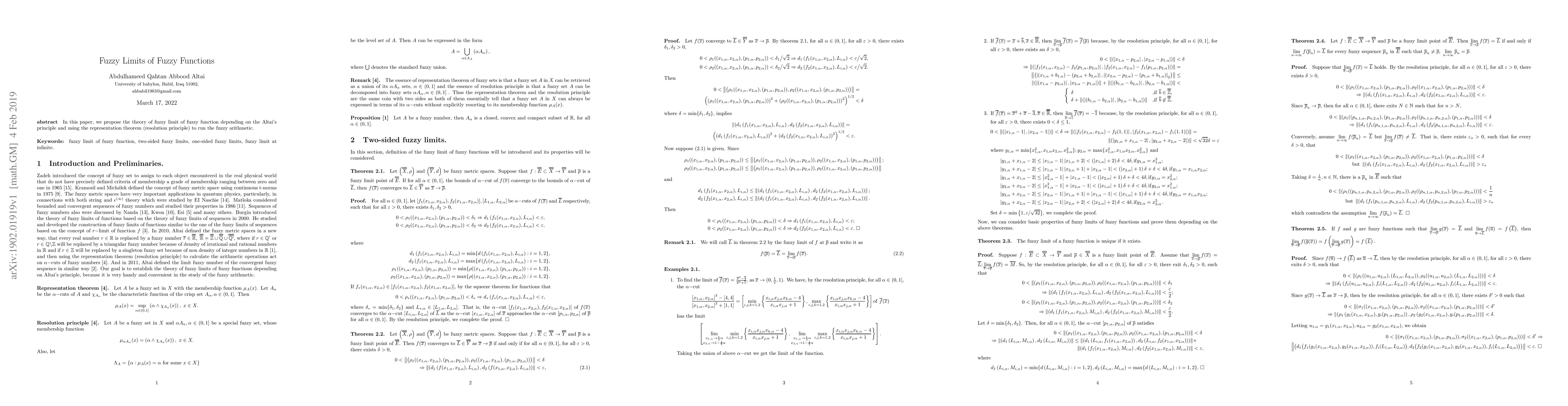 Summary: This paper introduces the concept of fuzzy limits for fuzzy functions based on the Altai principle and employs the representation theorem to facilitate fuzzy arithmetic, providing a theoretical framework for handling uncertainties in mathematical analysis.