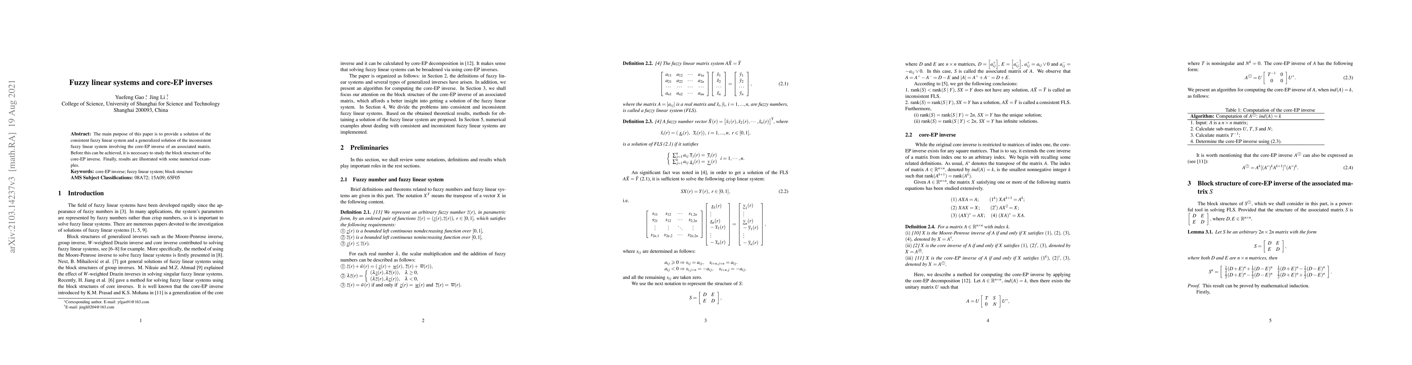 The main purpose of this paper is to provide a solution of the consistent fuzzy linear system and a generalized solution of the inconsistent fuzzy linear system involving the core-EP inverse of an associated matrix. Before this can be achieved, it is necessary to study the block structure of the core-EP inverse. Finally, results are illustrated with some numerical examples.