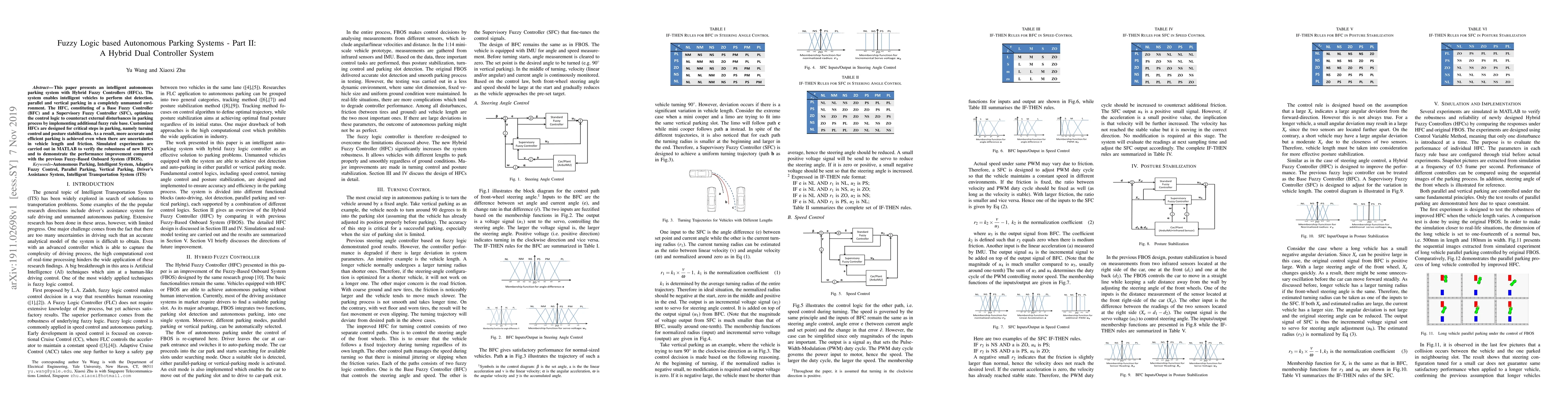 This paper introduces an autonomous parking system using Hybrid Fuzzy Controllers (HFCs) that optimizes control logic to enhance parking accuracy and efficiency, especially in uncertain conditions. Simulation results in MATLAB show improved performance over previous systems.