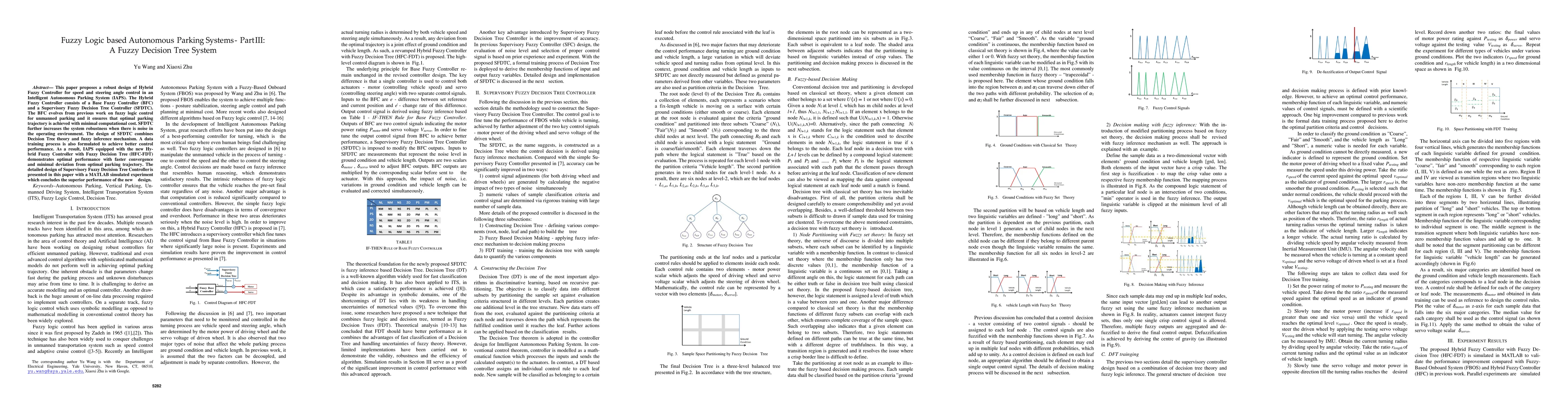 This paper proposes a robust design of Hybrid Fuzzy Controller for speed and steering angle control in an Intelligent Autonomous Parking System (IAPS). The Hybrid Fuzzy Controller consists of a Base Fuzzy Controller (BFC) and a Supervisory Fuzzy Decision Tree Controller (SFDTC). The BFC evolves from previous work on fuzzy logic control for unmanned parking and it ensures that optimal parking trajectory is achieved with minimal computational cost. SFDTC further increases the system robustness when there is noise in the operating environment. The design of SFDTC combines Decision Tree theory and fuzzy inference mechanism. A data training process is also formulated to achieve better control performance. As a result, IAPS equipped with the new Hybrid Fuzzy Controller with Fuzzy Decision Tree (HFC-FDT) demonstrates optimal performance with faster convergence and minimal deviation from optimal parking trajectory. The detailed design of Supervisory Fuzzy Decision Tree Controller is presented in this paper with a MATLAB simulated experiment which concludes the superior performance of the new design.