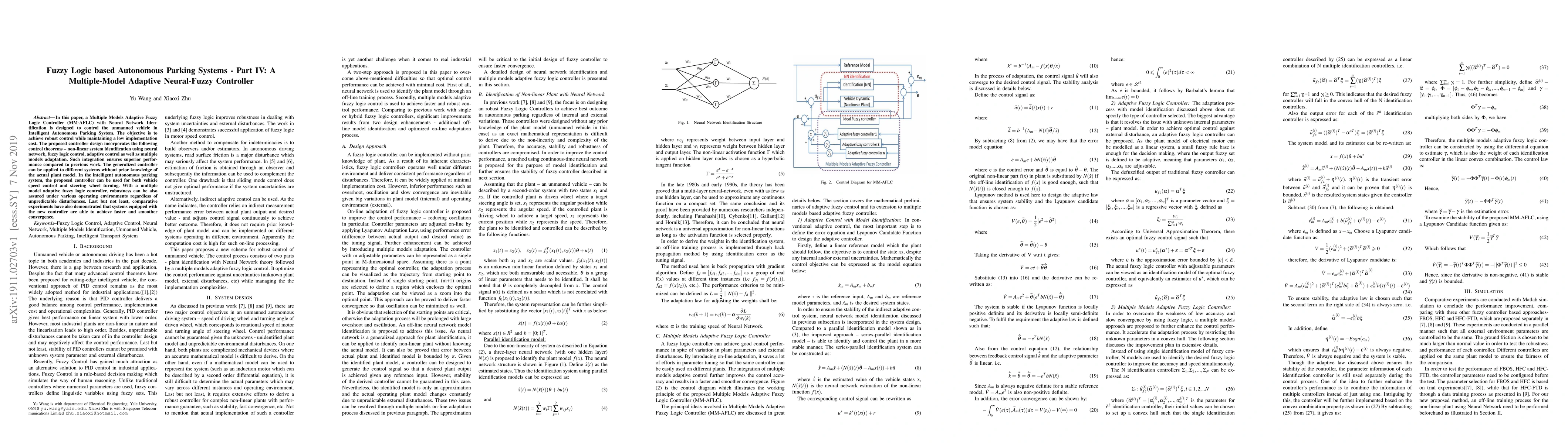 This paper presents a Multiple Models Adaptive Fuzzy Logic Controller (MM-AFLC) with neural network identification for an intelligent autonomous parking system, achieving robust control with low implementation cost. The integrated approach ensures superior performance and adaptability across different systems.