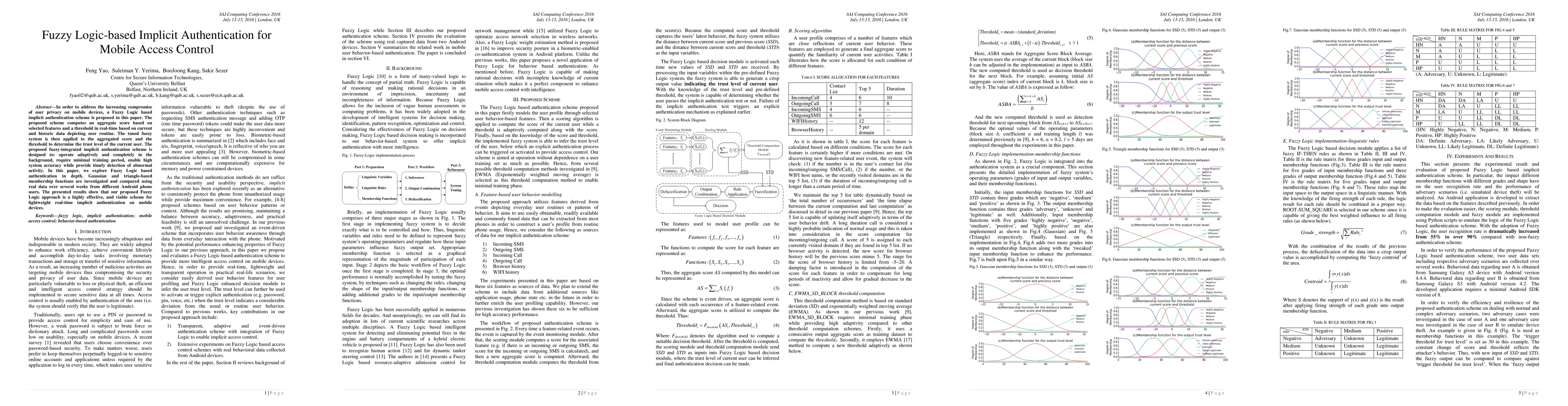 In order to address the increasing compromise of user privacy on mobile devices, a Fuzzy Logic based implicit authentication scheme is proposed in this paper. The proposed scheme computes an aggregate score based on selected features and a threshold in real-time based on current and historic data depicting user routine. The tuned fuzzy system is then applied to the aggregated score and the threshold to determine the trust level of the current user. The proposed fuzzy-integrated implicit authentication scheme is designed to: operate adaptively and completely in the background, require minimal training period, enable high system accuracy while provide timely detection of abnormal activity. In this paper, we explore Fuzzy Logic based authentication in depth. Gaussian and triangle-based membership functions are investigated and compared using real data over several weeks from different Android phone users. The presented results show that our proposed Fuzzy Logic approach is a highly effective, and viable scheme for lightweight real-time implicit authentication on mobile devices.