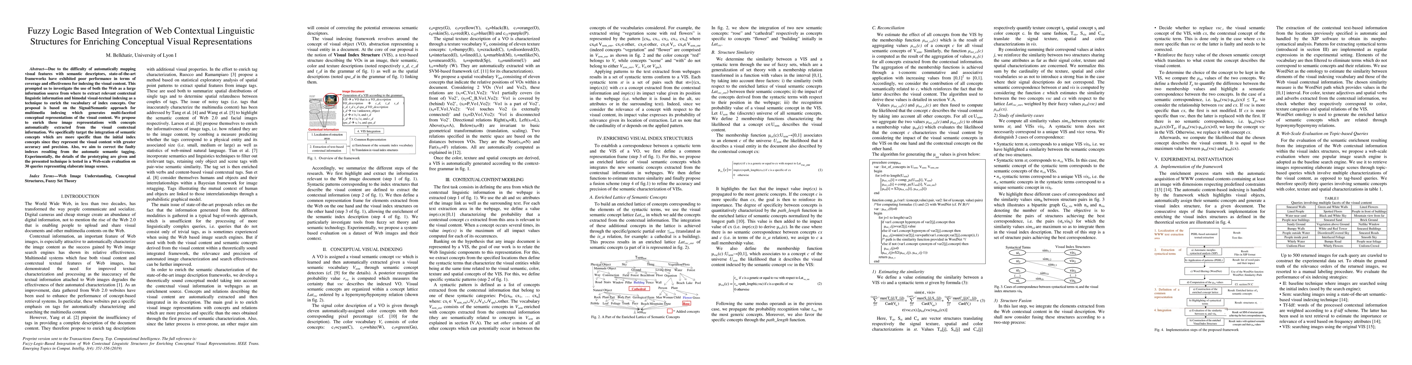 This paper proposes a fuzzy logic-based method to integrate web contextual linguistic structures for enhancing conceptual visual representations. The approach aims to improve the accuracy and precision of visual content indexing by extracting and incorporating more specific semantic concepts from visual context, thereby correcting automatic semantic tagging errors.