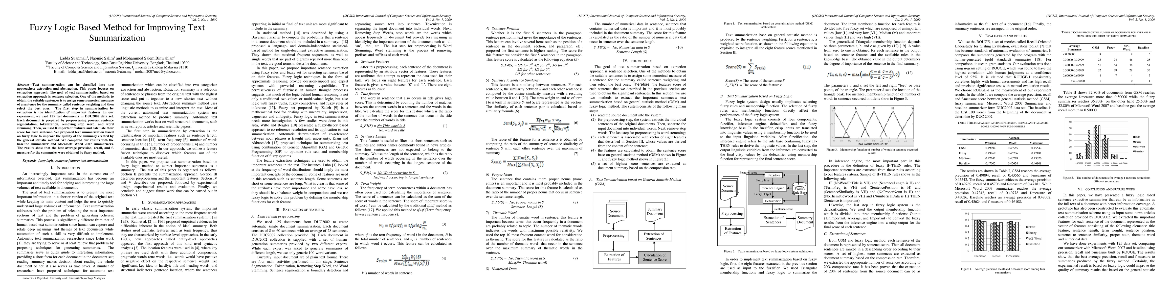 This paper proposes a fuzzy logic-based method for improving text summarization using the extraction approach, focusing on sentence selection and weighting. Experimental results show that the fuzzy logic method outperforms baseline and Microsoft Word 2007 summarizers in terms of precision, recall, and f-measure.