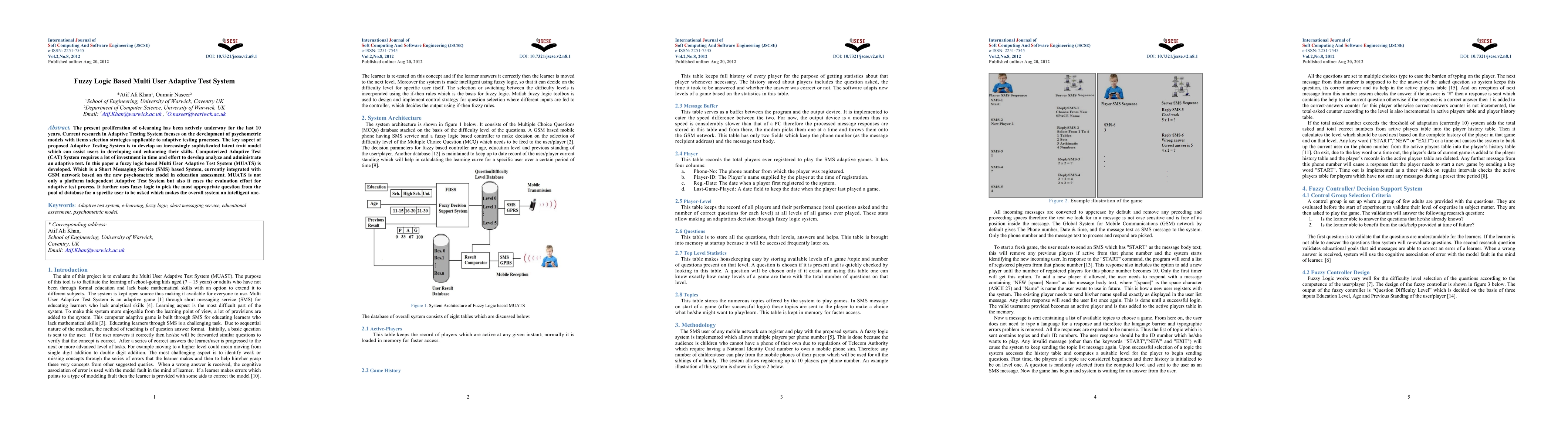 This paper proposes a fuzzy logic-based Multi User Adaptive Test System (MUATS) for e-learning, utilizing SMS for a platform-independent, GSM network-integrated approach. The system employs a sophisticated latent trait model and fuzzy logic to select the most appropriate questions for users, easing the evaluation effort in adaptive testing.