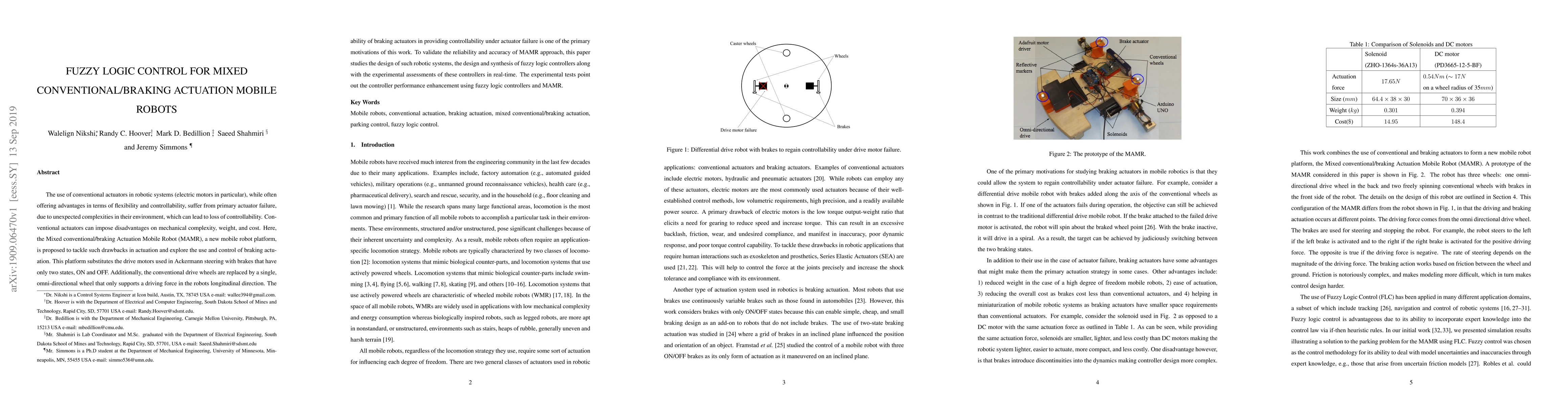 The use of conventional actuators in robotic systems (electric motors in particular), while often offering advantages in terms of flexibility and controllability, suffer from primary actuator failure,due to unexpected complexities in their environment, which can lead to loss of controllability. Conventional actuators can impose disadvantages on mechanical complexity, weight, and cost. Here,the Mixed conventional/braking Actuation Mobile Robot (MAMR), a new mobile robot platform,is proposed to tackle such drawbacks in actuation and explore the use and control of braking actuation. This platform substitutes the drive motors used in Ackermann steering with brakes that have only two states, ON and OFF. Additionally, the conventional drive wheels are replaced by a single,omni-directional wheel that only supports a driving force in the robots longitudinal direction. The ability of braking actuators in providing controllability under actuator failure is one of the primary motivations of this work. To validate the reliability and accuracy of MAMR approach, this paper studies the design of such robotic systems, the design and synthesis of fuzzy logic controllers along with the experimental assessments of these controllers in real-time. The experimental tests point out the controller performance enhancement using fuzzy logic controllers and MAMR.
