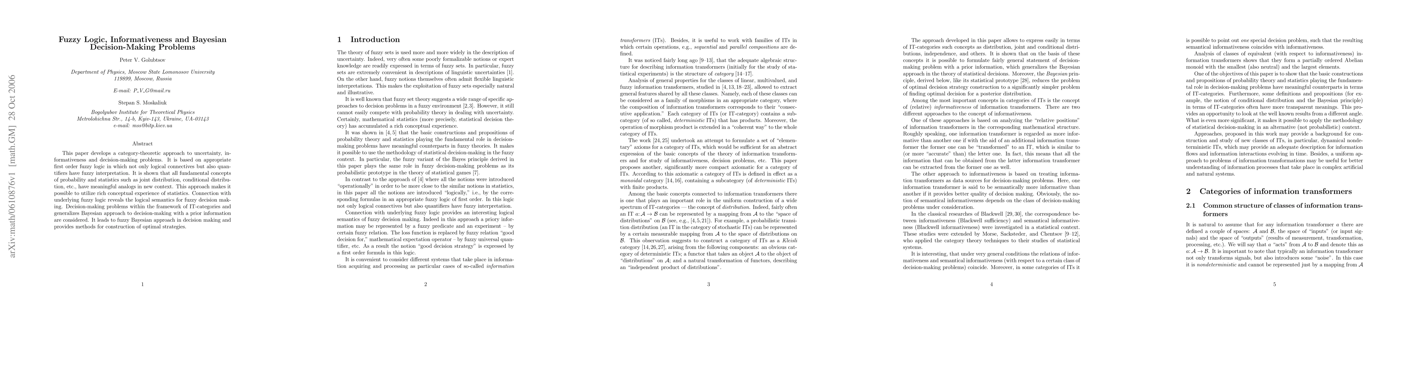 This paper develops a category-theoretic approach to uncertainty, informativeness and decision-making problems. It is based on appropriate first order fuzzy logic in which not only logical connectives but also quantifiers have fuzzy interpretation. It is shown that all fundamental concepts of probability and statistics such as joint distribution, conditional distribution, etc., have meaningful analogs in new context. This approach makes it possible to utilize rich conceptual experience of statistics. Connection with underlying fuzzy logic reveals the logical semantics for fuzzy decision making. Decision-making problems within the framework of IT-categories and generalizes Bayesian approach to decision-making with a prior information are considered. It leads to fuzzy Bayesian approach in decision making and provides methods for construction of optimal strategies.