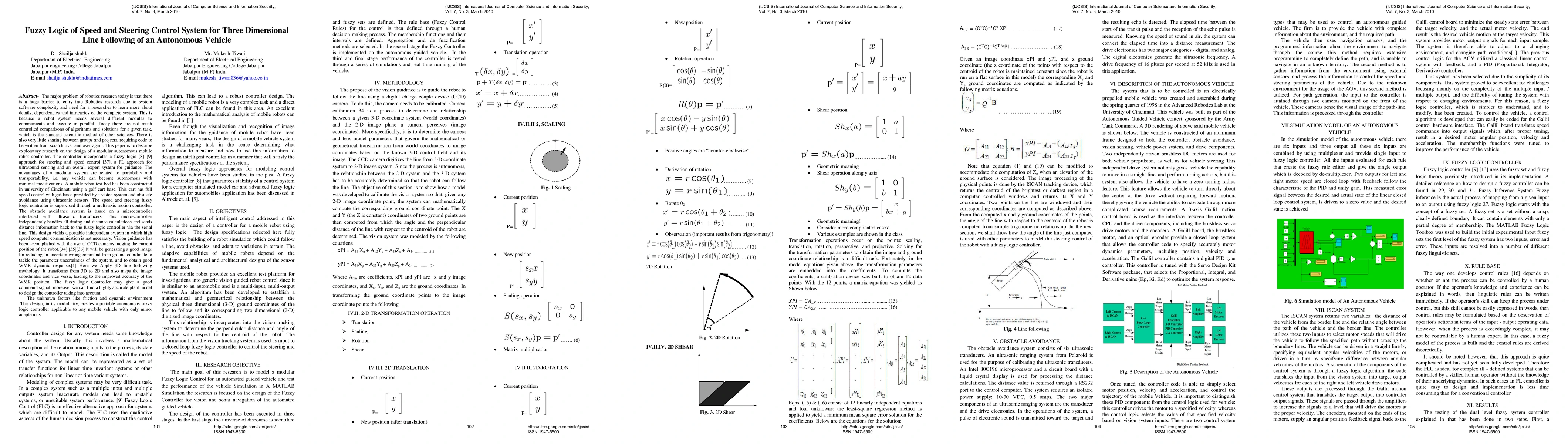 ... This paper is to describe exploratory research on the design of a modular autonomous mobile robot controller. The controller incorporates a fuzzy logic [8] [9] approach for steering and speed control [37], a FL approach for ultrasound sensing and an overall expert system for guidance. The advantages of a modular system are related to portability and transportability, i.e. any vehicle can become autonomous with minimal modifications. A mobile robot test bed has been constructed in university of Cincinnati using a golf cart base. This cart has full speed control with guidance provided by a vision system and obstacle avoidance using ultrasonic sensors. The speed and steering fuzzy logic controller is supervised through a multi-axis motion controller. The obstacle avoidance system is based on a microcontroller interfaced with ultrasonic transducers. This micro-controller independently handles all timing and distance calculations and sends distance information back to the fuzzy logic controller via the serial line. This design yields a portable independent system in which high speed computer communication is not necessary. Vision guidance has been accomplished with the use of CCD cameras judging the current position of the robot.[34] [35][36] It will be generating a good image for reducing an uncertain wrong command from ground coordinate to tackle the parameter uncertainties of the system, and to obtain good WMR dynamic response.[1] Here we Apply 3D line following mythology. It transforms from 3D to 2D and also maps the image coordinates and vice versa, leading to the improved accuracy of the WMR position. ...