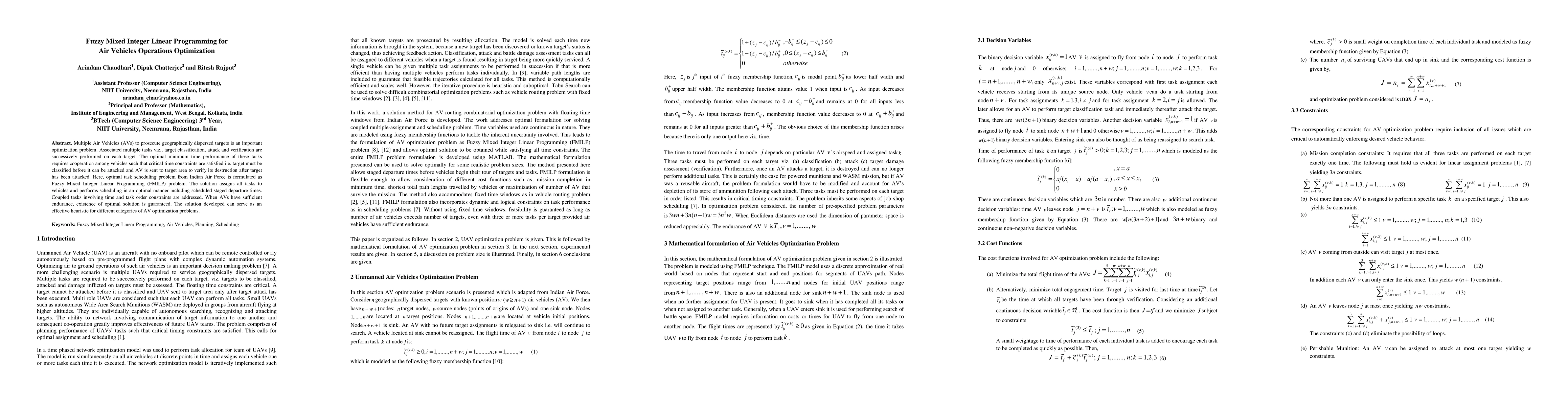 This paper formulates the optimal scheduling of multiple Air Vehicles for geographically dispersed target operations as a Fuzzy Mixed Integer Linear Programming (FMILP) problem, ensuring critical task order and time constraints are met. The developed heuristic solution guarantees optimal task assignment and scheduling, providing a robust approach for various Air Vehicle optimization scenarios.