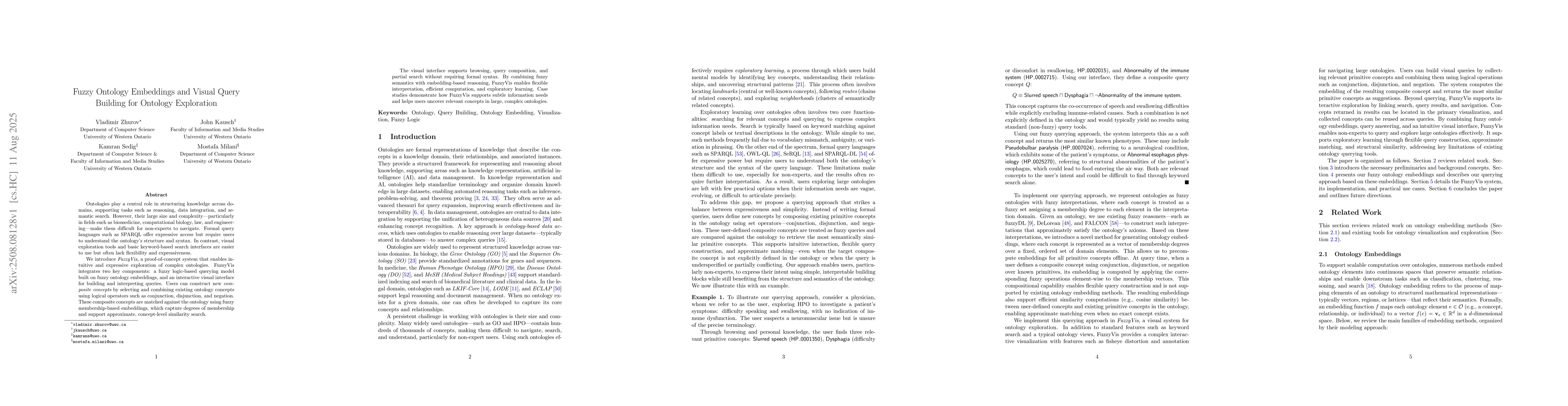 FuzzyVis, a prototype system, integrates fuzzy logic-based querying with fuzzy ontology embeddings and a visual interface for ontology exploration. It allows users to construct composite concepts via logical operators and matches them against the ontology using fuzzy membership-based embeddings.