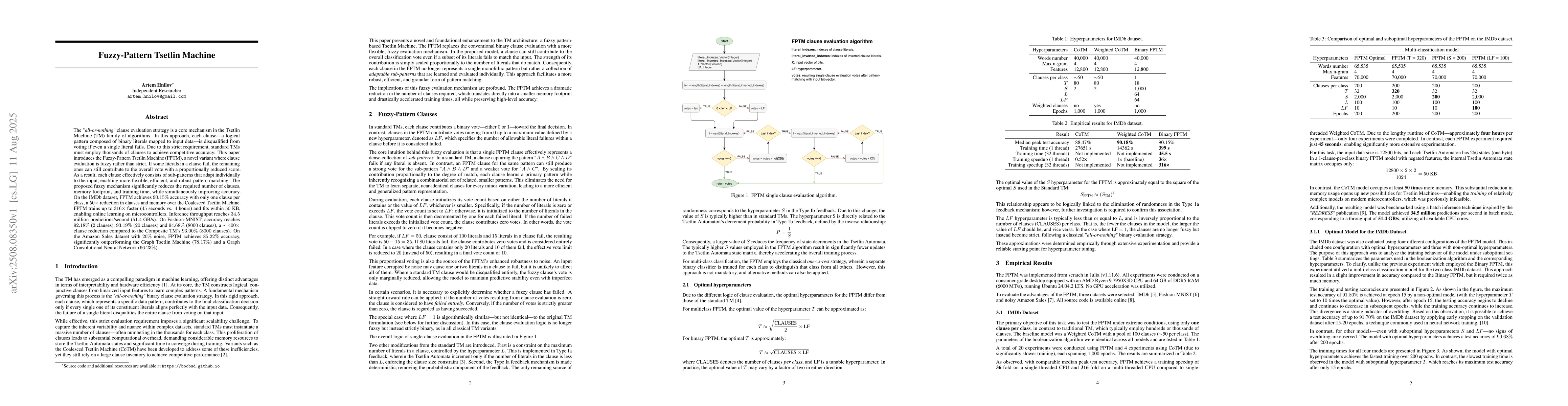 The "all-or-nothing" clause evaluation strategy is a core mechanism in the Tsetlin Machine (TM) family of algorithms. In this approach, each clause - a logical pattern composed of binary literals mapped to input data - is disqualified from voting if even a single literal fails. Due to this strict requirement, standard TMs must employ thousands of clauses to achieve competitive accuracy. This paper introduces the Fuzzy-Pattern Tsetlin Machine (FPTM), a novel variant where clause evaluation is fuzzy rather than strict. If some literals in a clause fail, the remaining ones can still contribute to the overall vote with a proportionally reduced score. As a result, each clause effectively consists of sub-patterns that adapt individually to the input, enabling more flexible, efficient, and robust pattern matching. The proposed fuzzy mechanism significantly reduces the required number of clauses, memory footprint, and training time, while simultaneously improving accuracy. On the IMDb dataset, FPTM achieves 90.15% accuracy with only one clause per class, a 50x reduction in clauses and memory over the Coalesced Tsetlin Machine. FPTM trains up to 316x faster (45 seconds vs. 4 hours) and fits within 50 KB, enabling online learning on microcontrollers. Inference throughput reaches 34.5 million predictions/second (51.4 GB/s). On Fashion-MNIST, accuracy reaches 92.18% (2 clauses), 93.19% (20 clauses) and 94.68% (8000 clauses), a ~400x clause reduction compared to the Composite TM's 93.00% (8000 clauses). On the Amazon Sales dataset with 20% noise, FPTM achieves 85.22% accuracy, significantly outperforming the Graph Tsetlin Machine (78.17%) and a Graph Convolutional Neural Network (66.23%).