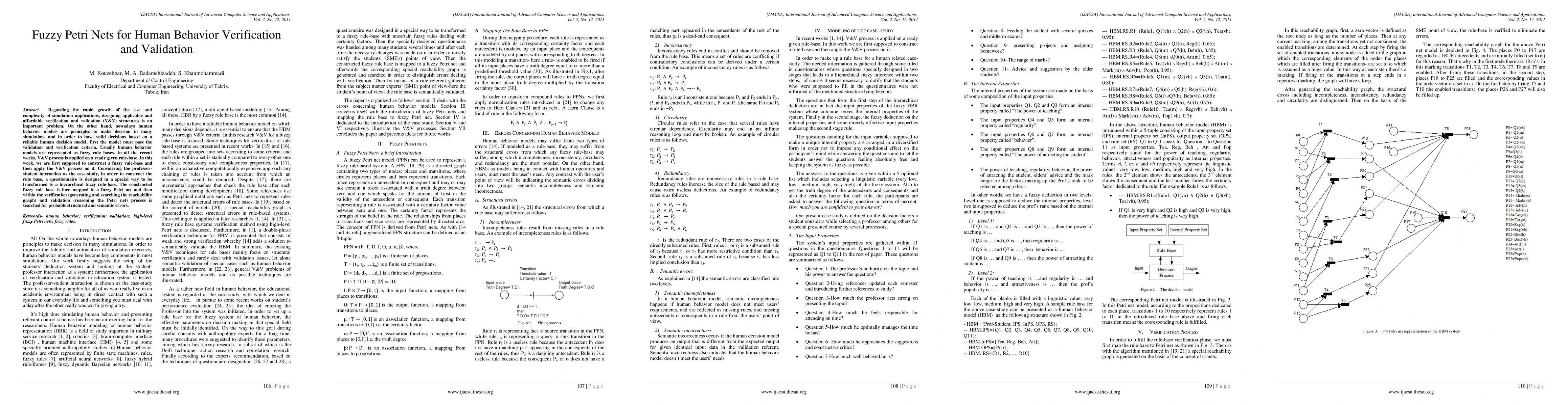 Regarding the rapid growth of the size and complexity of simulation applications, designing applicable and affordable verification and validation (V&V) structures is an important problem. On the other hand, nowadays human behavior models are principles to make decision in many simulations and in order to have valid decisions based on a reliable human decision model, first the model must pass the validation and verification criteria. Usually human behavior models are represented as fuzzy rule bases. In all the recent works, V&V process is applied on a ready given rule-base. In this work, we are first supposed to construct a fuzzy rule-base and then apply the V&V process on it. Considering the professor-student interaction as the case-study, in order to construct the rule base, a questionnaire is designed in a special way to be transformed to a hierarchical fuzzy rule-base. The constructed fuzzy rule base is then mapped to a fuzzy Petri net and then within the verification (generating and searching the reachability graph) and validation (reasoning the Petri net) process is searched for probable structural and semantic errors.