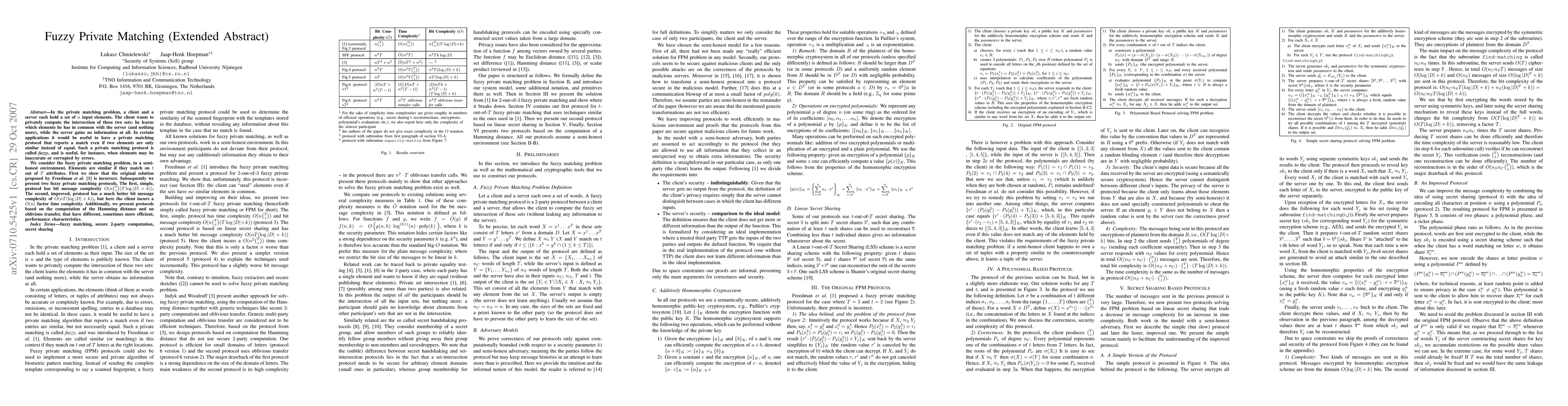 In the private matching problem, a client and a server each hold a set of $n$ input elements. The client wants to privately compute the intersection of these two sets: he learns which elements he has in common with the server (and nothing more), while the server gains no information at all. In certain applications it would be useful to have a private matching protocol that reports a match even if two elements are only similar instead of equal. Such a private matching protocol is called \emph{fuzzy}, and is useful, for instance, when elements may be inaccurate or corrupted by errors. We consider the fuzzy private matching problem, in a semi-honest environment. Elements are similar if they match on $t$ out of $T$ attributes. First we show that the original solution proposed by Freedman et al. is incorrect. Subsequently we present two fuzzy private matching protocols. The first, simple, protocol has bit message complexity $O(n \binom{T}{t} (T \log{|D|}+k))$. The second, improved, protocol has a much better bit message complexity of $O(n T (\log{|D|}+k))$, but here the client incurs a O(n) factor time complexity. Additionally, we present protocols based on the computation of the Hamming distance and on oblivious transfer, that have different, sometimes more efficient, performance characteristics.