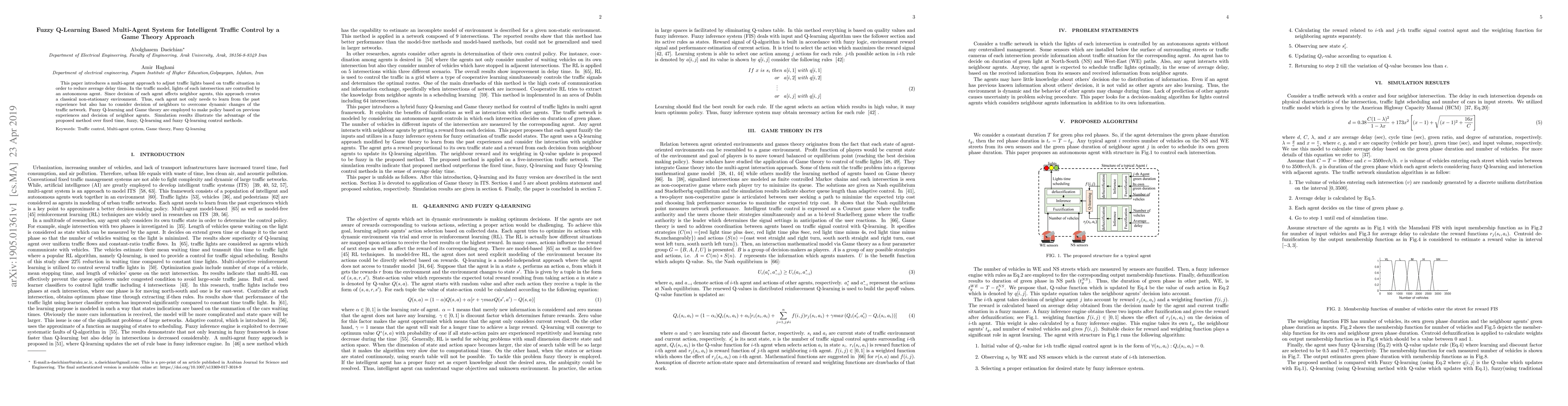 This paper proposes a multi-agent system using fuzzy Q-learning and game theory to dynamically adjust traffic lights, reducing average delay times. Simulation results show this method outperforms fixed time, fuzzy, Q-learning, and fuzzy Q-learning control methods.