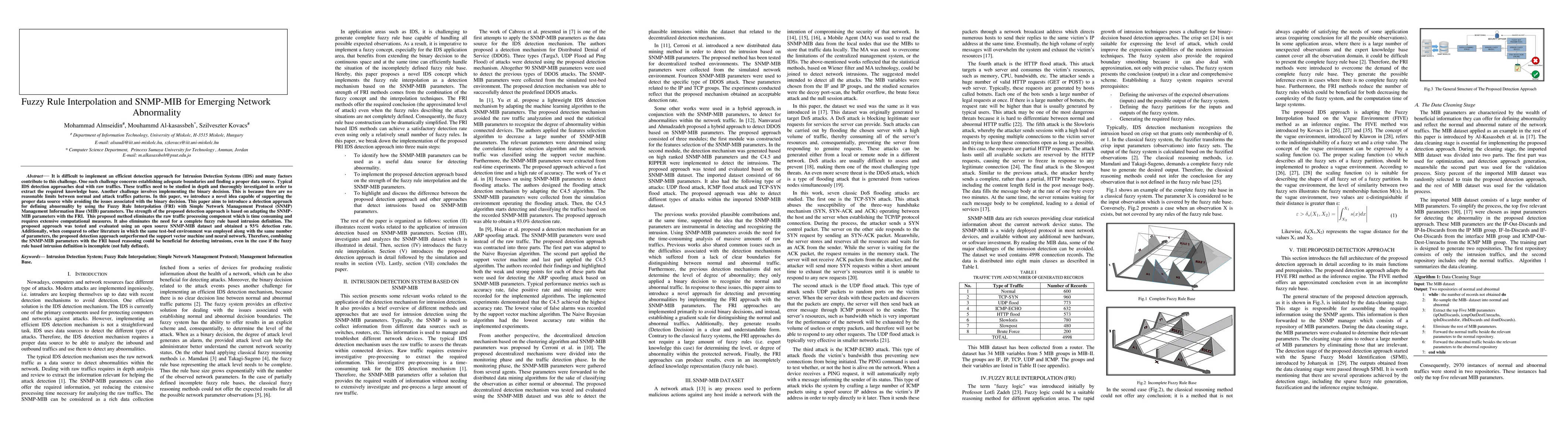 This paper proposes a novel detection approach for Intrusion Detection Systems using Fuzzy Rule Interpolation (FRI) with SNMP-MIB parameters, which eliminates the need for raw traffic processing and provides a 93% detection rate. The method outperforms traditional machine learning techniques by leveraging SNMP-MIB parameters and FRI for more efficient network abnormality detection.