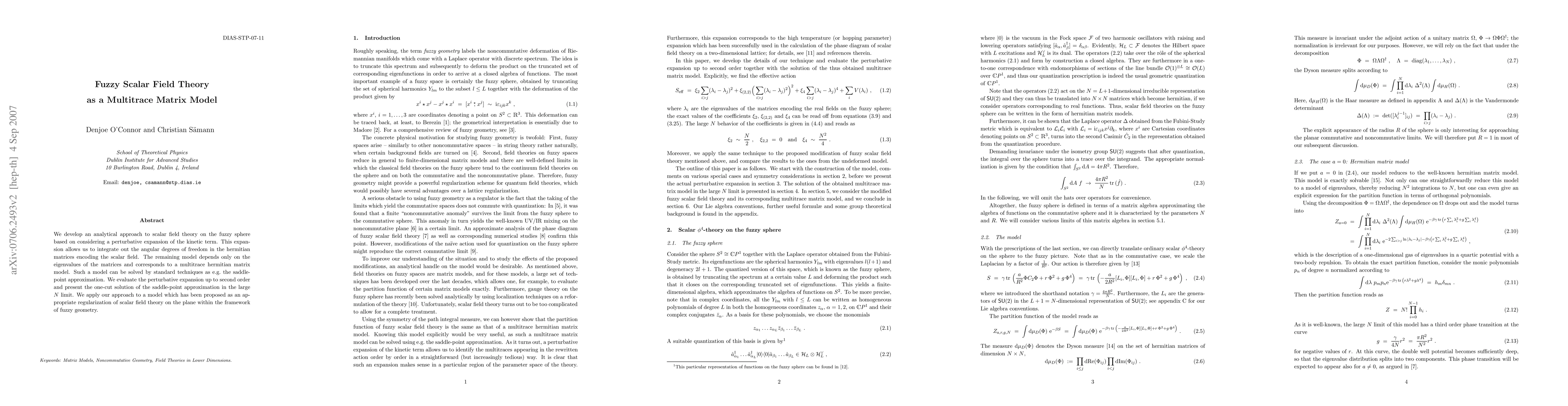 This paper develops an analytical method for scalar field theory on a fuzzy sphere by perturbatively expanding the kinetic term, integrating out angular degrees of freedom, and deriving a multitrace matrix model solvable via saddle-point approximation. The authors evaluate the expansion up to second order and present a one-cut solution in the large N limit, applying the approach to a proposed regularization model of scalar field theory.