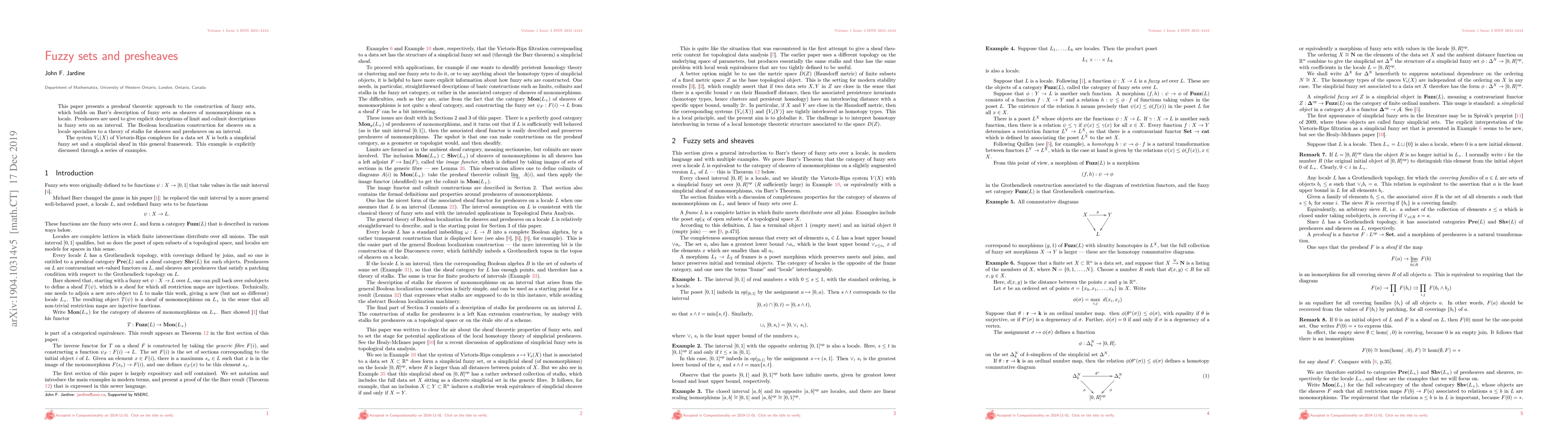 This note presents a presheaf theoretic approach to the construction of fuzzy sets, which builds on Barr's description of fuzzy sets as sheaves of monomorphisms on a locale. A presheaf-theoretic method is used to show that the category of fuzzy sets is complete and co-complete, and to present explicit descriptions of classical fuzzy sets that arise as limits and colimits. The Boolean localization construction for sheaves and presheaves on a locale L specializes to a theory of stalks if L approximates the structure of a closed interval in the real line. The system V(X) of Vietoris-Rips complexes for a data cloud X becomes both a simplicial fuzzy set and a simplicial sheaf in this general framework. This example is explicitly discussed in this paper, in stages.