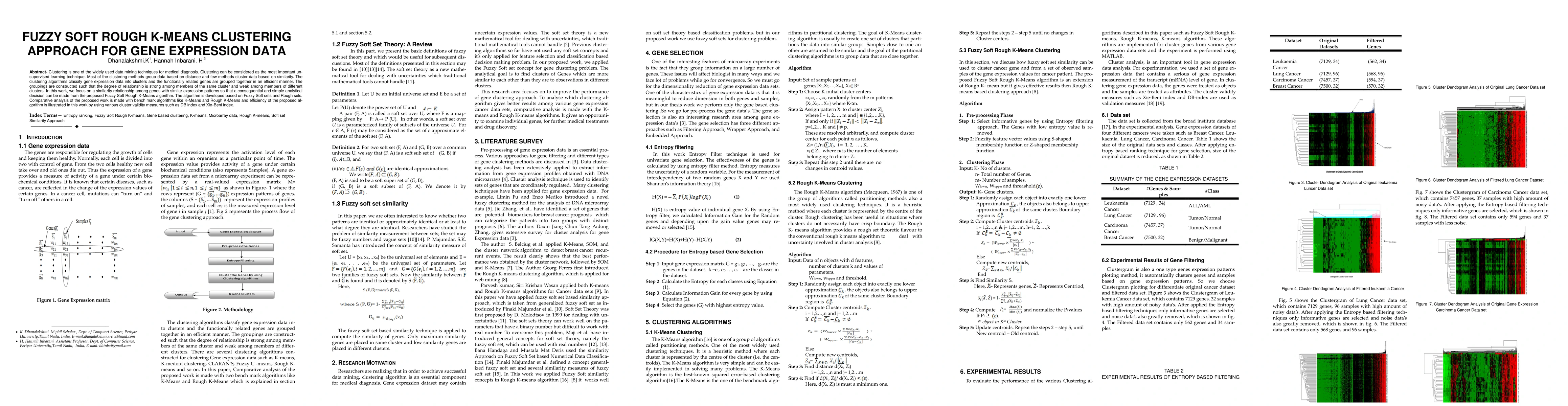 Clustering is one of the widely used data mining techniques for medical diagnosis. Clustering can be considered as the most important unsupervised learning technique. Most of the clustering methods group data based on distance and few methods cluster data based on similarity. The clustering algorithms classify gene expression data into clusters and the functionally related genes are grouped together in an efficient manner. The groupings are constructed such that the degree of relationship is strong among members of the same cluster and weak among members of different clusters. In this work, we focus on a similarity relationship among genes with similar expression patterns so that a consequential and simple analytical decision can be made from the proposed Fuzzy Soft Rough K-Means algorithm. The algorithm is developed based on Fuzzy Soft sets and Rough sets. Comparative analysis of the proposed work is made with bench mark algorithms like K-Means and Rough K-Means and efficiency of the proposed algorithm is illustrated in this work by using various cluster validity measures such as DB index and Xie-Beni index.