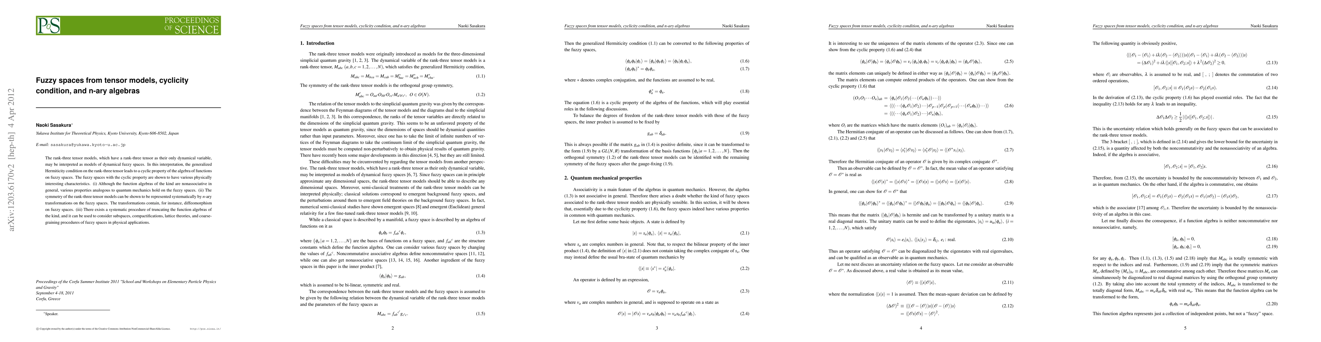 This paper explores rank-three tensor models as models of dynamical fuzzy spaces, revealing a cyclic property from the generalized Hermiticity condition. The study shows that these fuzzy spaces exhibit properties akin to quantum mechanics and can be systematically transformed using n-ary transformations, including diffeomorphisms, for physical applications.