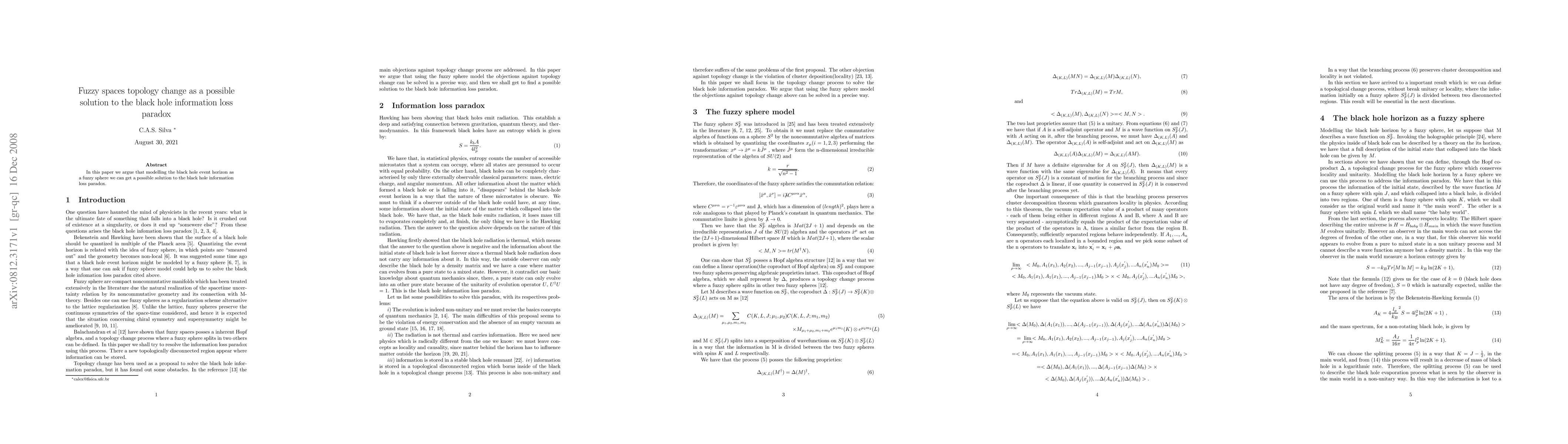 Summary: This paper proposes that treating the black hole event horizon as a fuzzy sphere may provide a solution to the black hole information loss paradox, suggesting that topology changes in fuzzy spaces could preserve information.