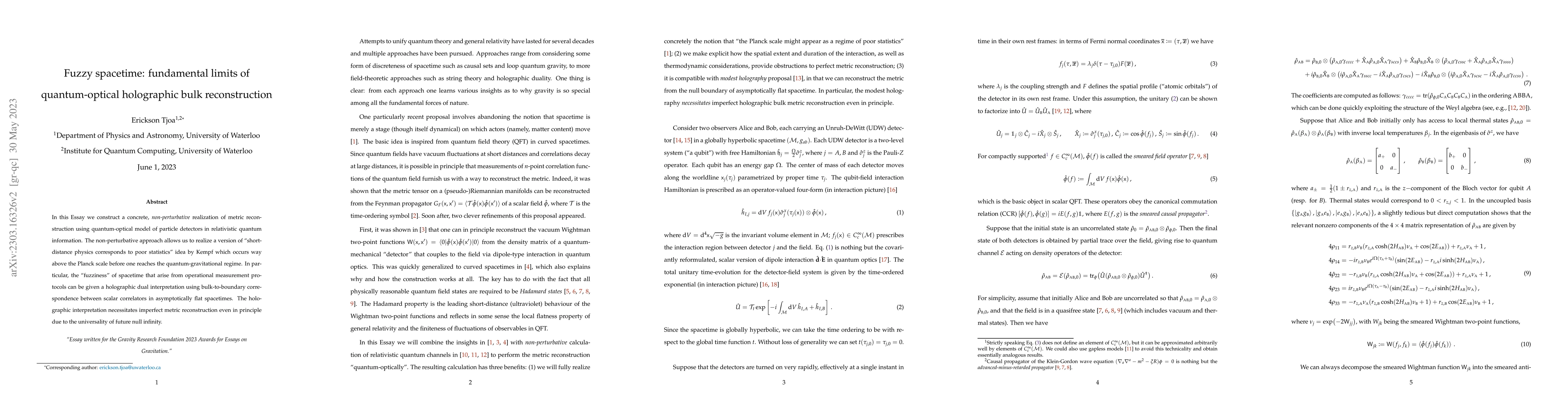 In this Essay we construct a concrete, non-perturbative realization of metric reconstruction using quantum-optical model of particle detectors in relativistic quantum information. The non-perturbative approach allows us to realize a version of "short-distance physics corresponds to poor statistics" idea by Kempf which occurs way above the Planck scale before one reaches the quantum-gravitational regime. In particular, the "fuzziness" of spacetime that arise from operational measurement protocols can be given a holographic dual interpretation using bulk-to-boundary correspondence between scalar correlators in asymptotically flat spacetimes. The holographic interpretation necessitates imperfect metric reconstruction even in principle due to the universality of future null infinity.