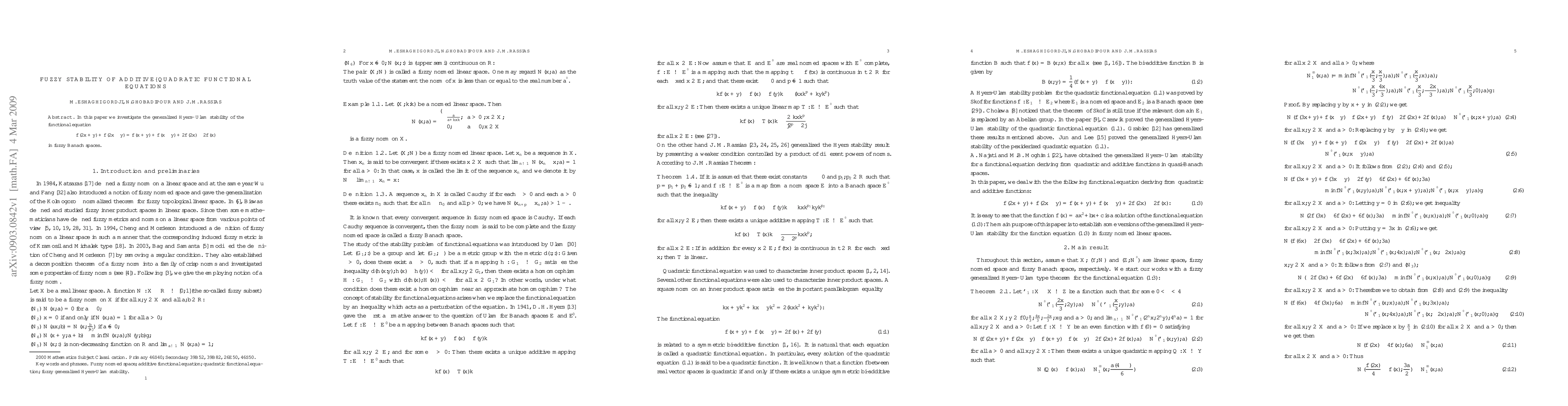 In this paper we investigate the generalized Hyers- Ulam stability of the functional equation $$f (2x +y)+f (2x -y)= f (x + y)+ f (x -y)+2f (2x)-2f (x)$$ in fuzzy Banach spaces.