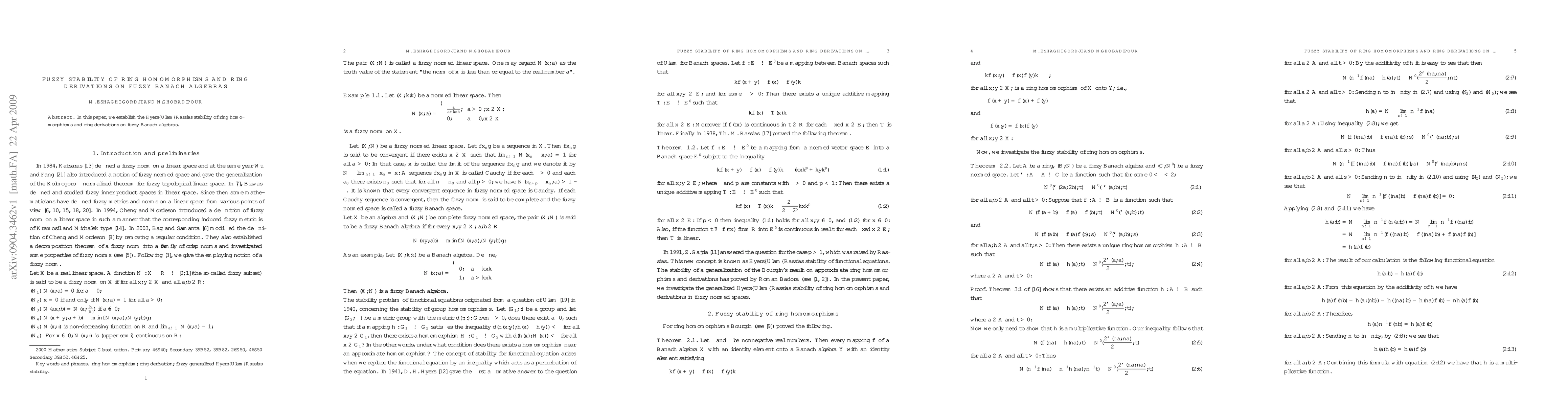 Summary: This paper demonstrates the Hyers-Ulam-Rassias stability of ring homomorphisms and derivations in the context of fuzzy Banach algebras, extending classical stability results to this abstract mathematical setting.