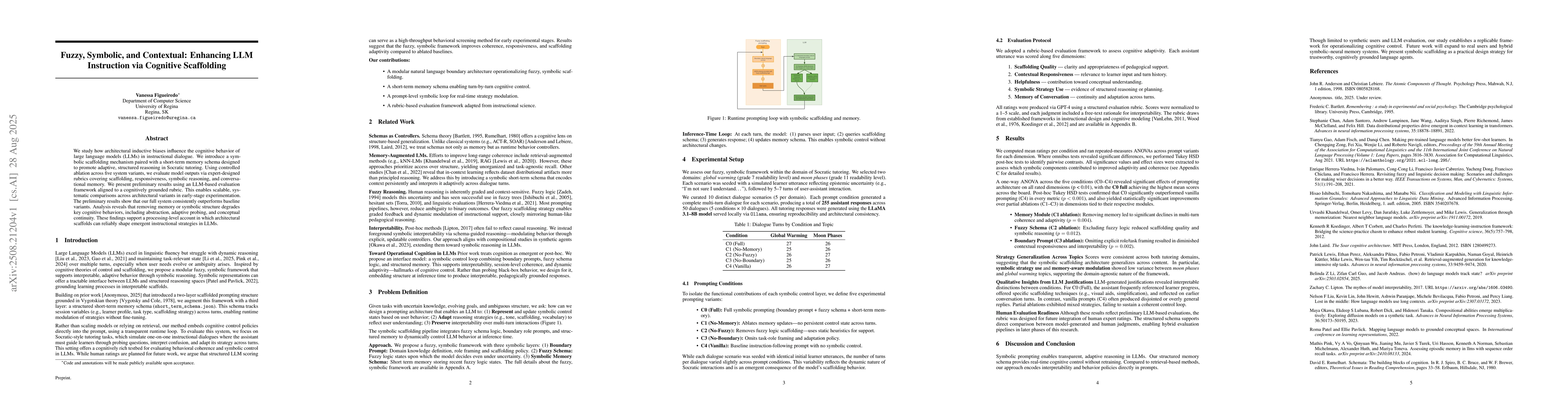 We study how architectural inductive biases influence the cognitive behavior of large language models (LLMs) in instructional dialogue. We introduce a symbolic scaffolding mechanism paired with a short-term memory schema designed to promote adaptive, structured reasoning in Socratic tutoring. Using controlled ablation across five system variants, we evaluate model outputs via expert-designed rubrics covering scaffolding, responsiveness, symbolic reasoning, and conversational memory. We present preliminary results using an LLM-based evaluation framework aligned to a cognitively grounded rubric. This enables scalable, systematic comparisons across architectural variants in early-stage experimentation. The preliminary results show that our full system consistently outperforms baseline variants. Analysis reveals that removing memory or symbolic structure degrades key cognitive behaviors, including abstraction, adaptive probing, and conceptual continuity. These findings support a processing-level account in which architectural scaffolds can reliably shape emergent instructional strategies in LLMs.