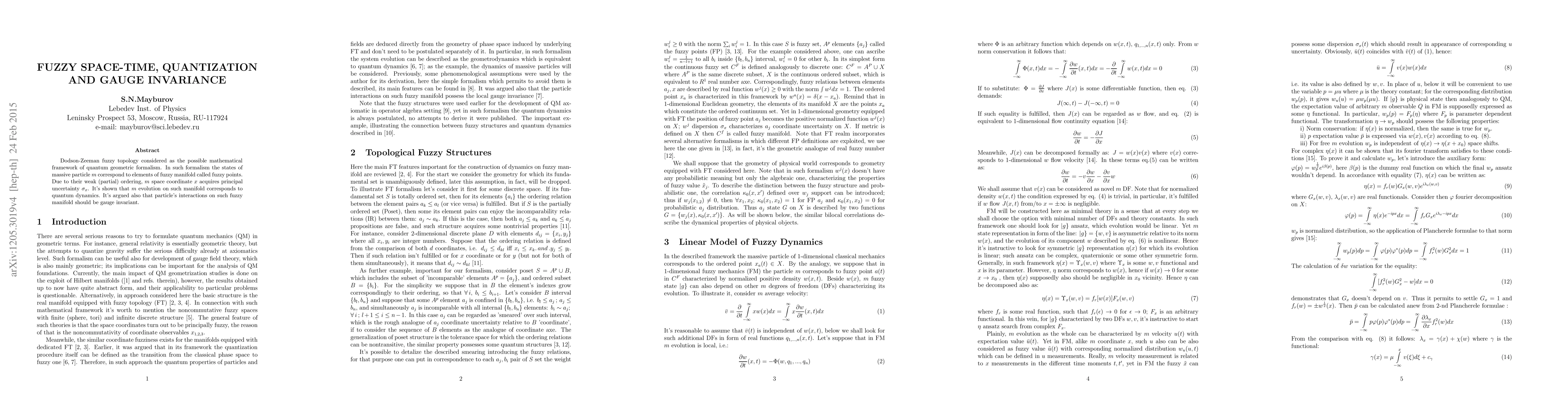 This paper explores fuzzy topology as a mathematical framework for quantum geometric formalism, demonstrating that particle states correspond to fuzzy points on a fuzzy manifold. The study shows that particle evolution adheres to Schrödinger and Dirac equations under minimal assumptions, and argues for gauge invariance in particle interactions on this fuzzy manifold.