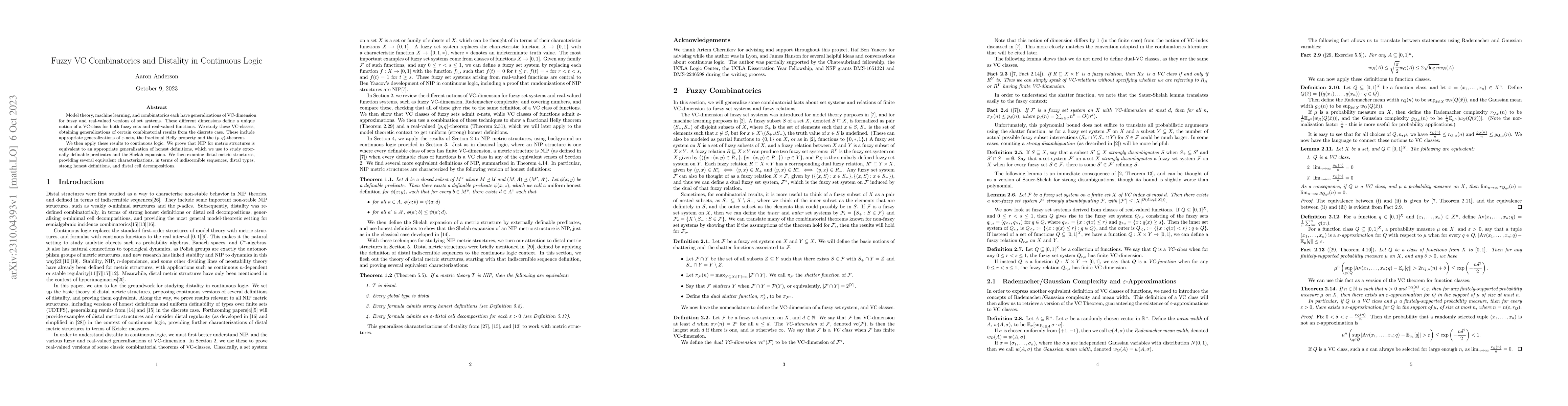 This paper generalizes VC-combinatorics to fuzzy and real-valued set systems, establishing new notions of VC-classes and extending combinatorial results like $\varepsilon$-nets and the fractional Helly property. It then applies these results to continuous logic, proving equivalences between NIP for metric structures and generalized honest definitions, and exploring distal metric structures through various characterizations.