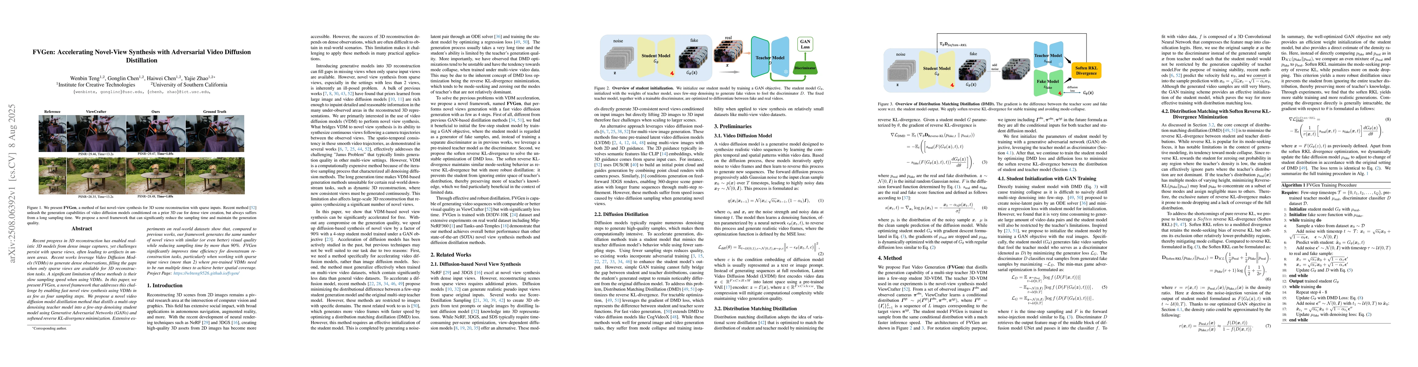 Recent progress in 3D reconstruction has enabled realistic 3D models from dense image captures, yet challenges persist with sparse views, often leading to artifacts in unseen areas. Recent works leverage Video Diffusion Models (VDMs) to generate dense observations, filling the gaps when only sparse views are available for 3D reconstruction tasks. A significant limitation of these methods is their slow sampling speed when using VDMs. In this paper, we present FVGen, a novel framework that addresses this challenge by enabling fast novel view synthesis using VDMs in as few as four sampling steps. We propose a novel video diffusion model distillation method that distills a multi-step denoising teacher model into a few-step denoising student model using Generative Adversarial Networks (GANs) and softened reverse KL-divergence minimization. Extensive experiments on real-world datasets show that, compared to previous works, our framework generates the same number of novel views with similar (or even better) visual quality while reducing sampling time by more than 90%. FVGen significantly improves time efficiency for downstream reconstruction tasks, particularly when working with sparse input views (more than 2) where pre-trained VDMs need to be run multiple times to achieve better spatial coverage.