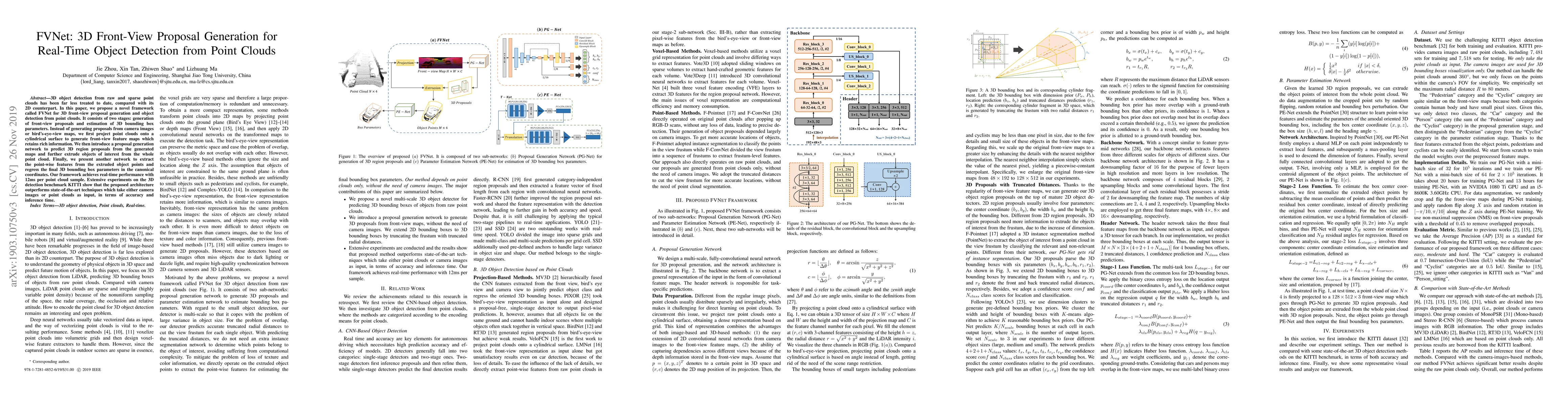 FVNet introduces a novel framework for 3D front-view proposal generation and object detection from point clouds, projecting them onto cylindrical surfaces to retain rich information before generating region proposals and estimating 3D bounding boxes, achieving real-time performance and outperforming state-of-the-art methods on the KITTI benchmark.