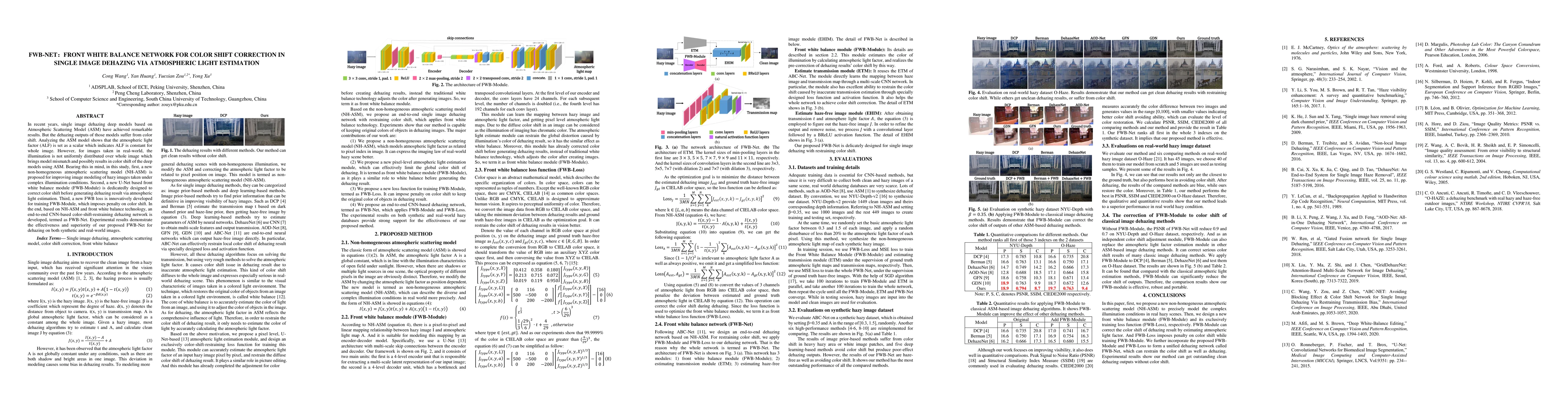 This paper proposes FWB-Net, a novel CNN-based network for single image dehazing that addresses color shift issues. The authors introduce a non-homogeneous atmospheric scattering model (NH-ASM) and a U-Net-based front white balance module (FWB-Module) to correct color shifts before dehazing, achieving superior results on both synthetic and real-world images.
