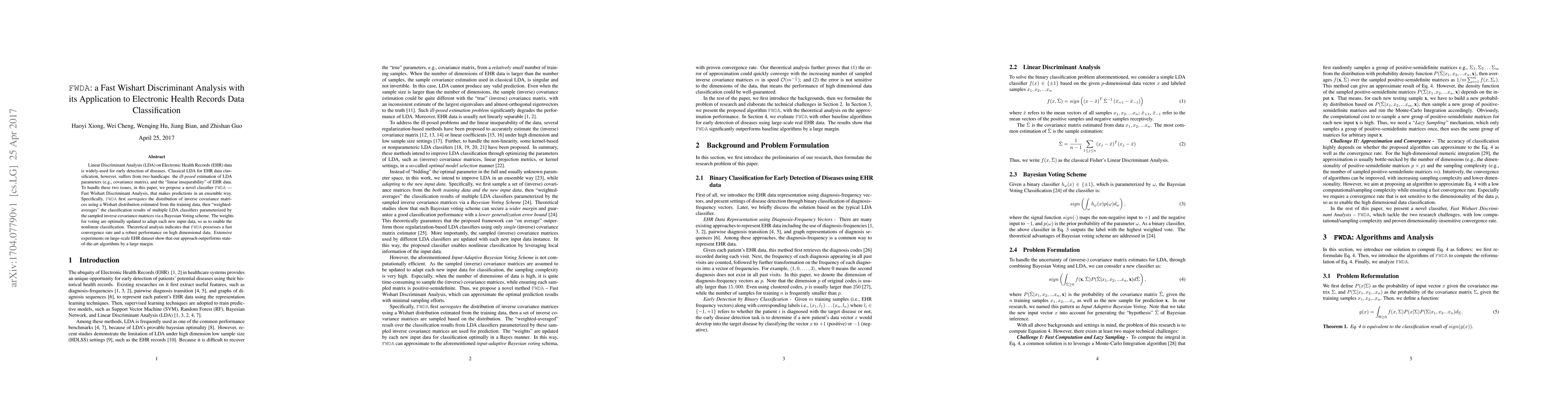 This paper proposes FWDA, a Fast Wishart Discriminant Analysis method for classifying Electronic Health Records, addressing the challenges of LDA parameter estimation and data non-linearity. FWDA uses a Wishart distribution to model inverse covariance matrices and employs Bayesian Voting to combine multiple LDA classifiers for optimal nonlinear classification.