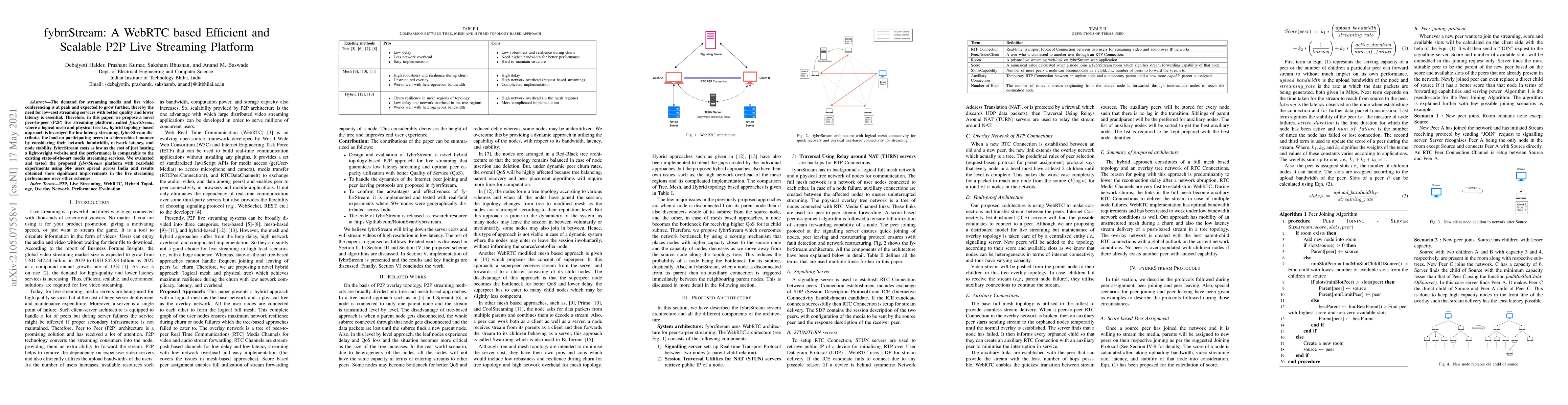 This paper proposes fybrrStream, a WebRTC-based P2P live streaming platform utilizing a hybrid topology for low latency and scalable streaming. The platform optimizes load distribution among peers based on network conditions, achieving performance comparable to state-of-the-art services at minimal cost.