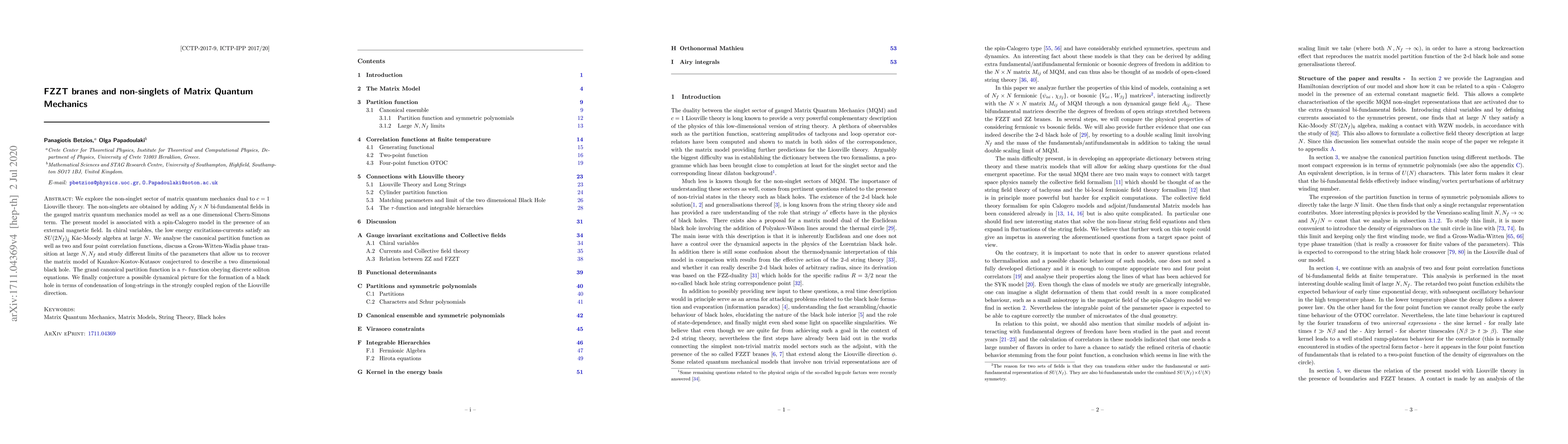 We explore the non-singlet sector of matrix quantum mechanics dual to $c=1$ Liouville theory. The non-singlets are obtained by adding $N_{f}\times N$ bi-fundamental fields in the gauged matrix quantum mechanics model as well as a one dimensional Chern-Simons term. The present model is associated with a spin-Calogero model in the presence of external magnetic field. In chiral variables, the low energy excitations-currents satisfy an ${SU(2N_{f})}_{\tilde{k}}$ K\v{a}c-Moody algebra at large $N$. We analyse the canonical partition function as well as two and four point correlation functions, discuss a Gross-Witten-Wadia phase transition at large $N, N_f$ and study different limits of the parameters that allow us to recover the matrix model of Kazakov-Kostov-Kutasov conjectured to describe a two dimensional black hole. The grand canonical partition function is a $\tau$- function obeying discrete soliton equations. We finally conjecture a possible dynamical picture for the formation of a black hole in terms of condensation of long-strings in the strongly coupled region of the Liouville direction.
