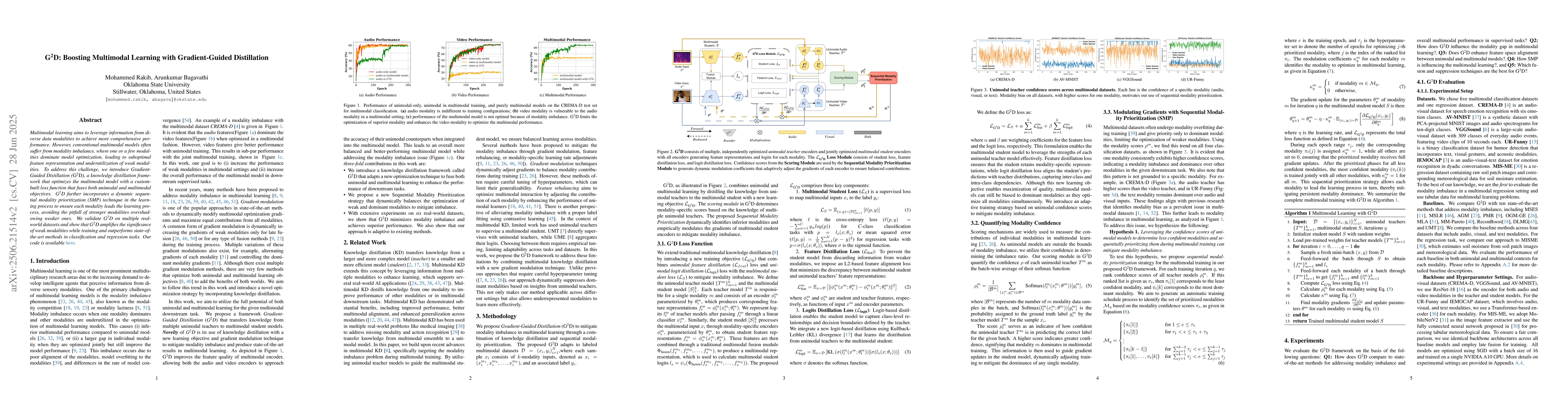 Multimodal learning aims to leverage information from diverse data modalities to achieve more comprehensive performance. However, conventional multimodal models often suffer from modality imbalance, where one or a few modalities dominate model optimization, leading to suboptimal feature representation and underutilization of weak modalities. To address this challenge, we introduce Gradient-Guided Distillation (G$^{2}$D), a knowledge distillation framework that optimizes the multimodal model with a custom-built loss function that fuses both unimodal and multimodal objectives. G$^{2}$D further incorporates a dynamic sequential modality prioritization (SMP) technique in the learning process to ensure each modality leads the learning process, avoiding the pitfall of stronger modalities overshadowing weaker ones. We validate G$^{2}$D on multiple real-world datasets and show that G$^{2}$D amplifies the significance of weak modalities while training and outperforms state-of-the-art methods in classification and regression tasks. Our code is available at https://github.com/rAIson-Lab/G2D.