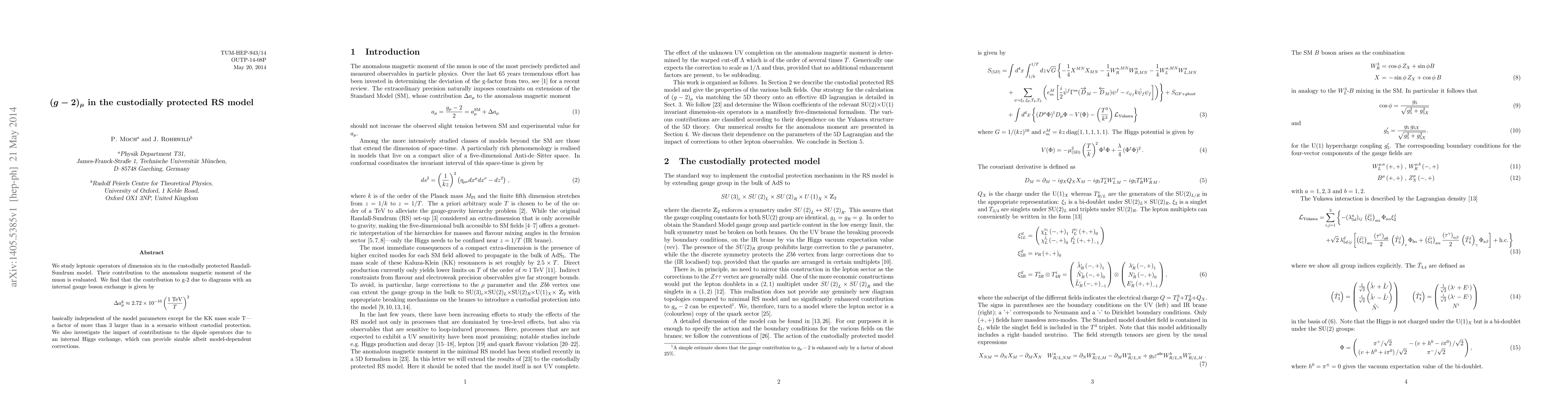 The study evaluates leptonic operators of dimension six in the custodially protected Randall-Sundrum model, focusing on their contribution to the anomalous magnetic moment of the muon (g-2).