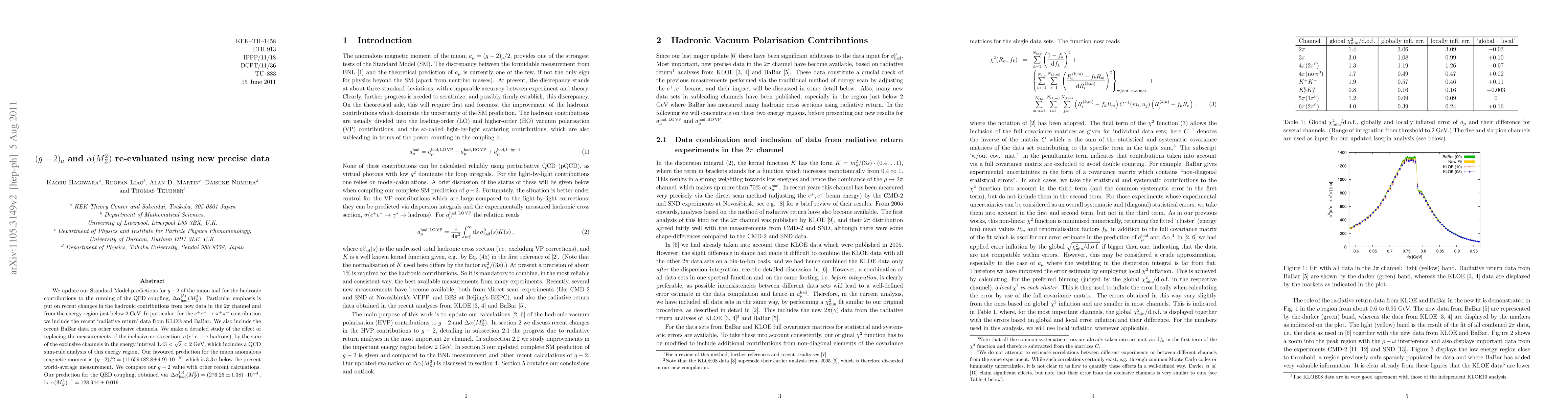 This paper updates Standard Model predictions for the muon's anomalous magnetic moment (g-2) and the hadronic contributions to the QED coupling's running, incorporating new precise data from the 2π channel and energy region just below 2 GeV. The favored prediction for (g-2)/2 is 11659182.8 ± 4.9 × 10^(-10), which is 3.3 sigma below the current world-average measurement.