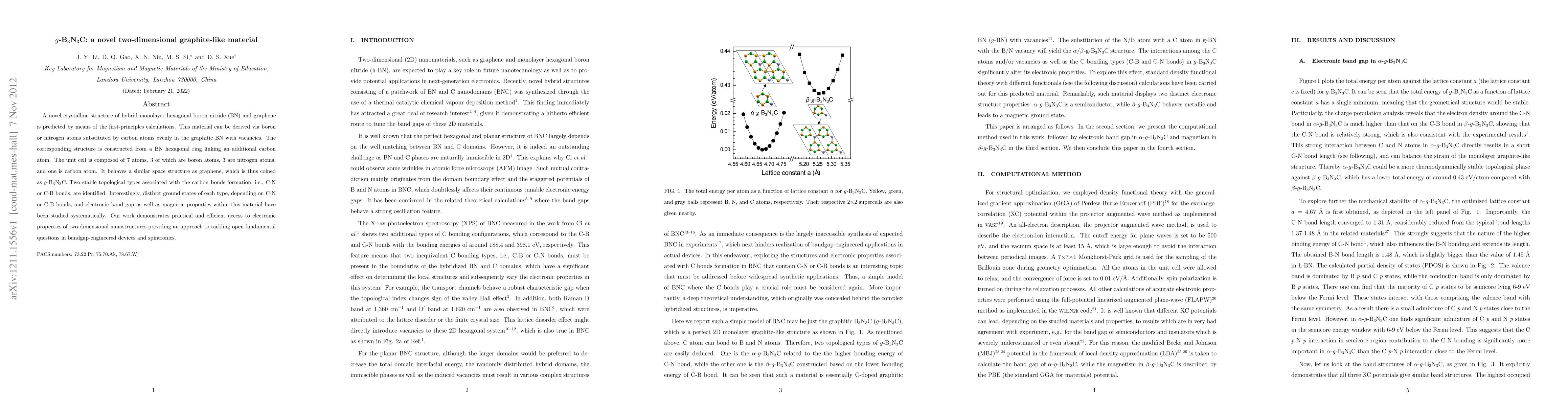A novel crystalline structure of hybrid monolayer hexagonal boron nitride (BN) and graphene is predicted by means of the first-principles calculations. This material can be derived via boron or nitrogen atoms substituted by carbon atoms evenly in the graphitic BN with vacancies. The corresponding structure is constructed from a BN hexagonal ring linking an additional carbon atom. The unit cell is composed of 7 atoms, 3 of which are boron atoms, 3 are nitrogen atoms, and one is carbon atom. It behaves a similar space structure as graphene, which is thus coined as g-B3N3C. Two stable topological types associated with the carbon bonds formation, i.e., C-N or C-B bonds, are identified. Interestingly, distinct ground states of each type, depending on C-N or C-B bonds, and electronic band gap as well as magnetic properties within this material have been studied systematically. Our work demonstrates practical and efficient access to electronic properties of two-dimensional nanostructures providing an approach to tackling open fundamental questions in bandgap-engineered devices and spintronics.