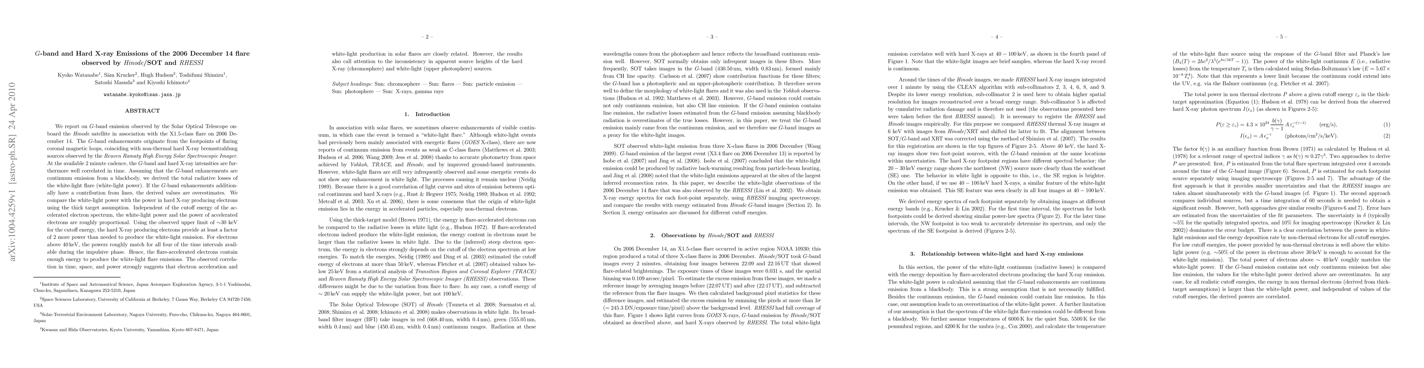 This paper investigates the G-band and hard X-ray emissions during the X1.5-class flare on December 14, 2006, finding a strong temporal correlation between G-band enhancements and hard X-ray sources. The study suggests that flare-accelerated electrons possess sufficient energy to produce the observed white-light emissions, highlighting a close relationship between electron acceleration and white-light production.