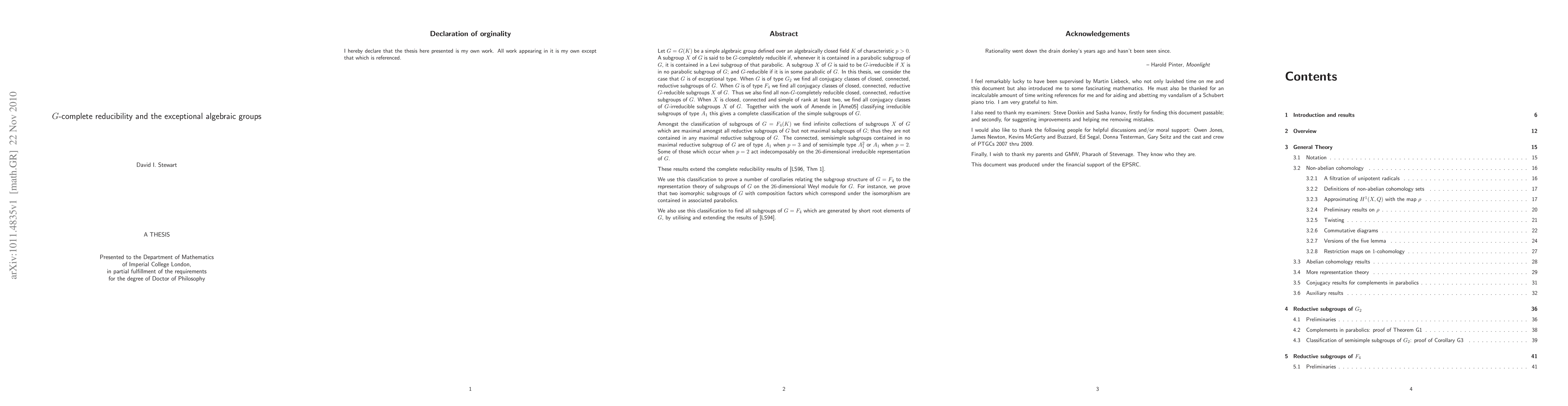 Let $G=G(K)$ be a simple algebraic group defined over an algebraically closed field $K$ of characteristic $p>0$. A subgroup $X$ of $G$ is said to be $G$-completely reducible if, whenever it is contained in a parabolic subgroup of $G$, it is contained in a Levi subgroup of that parabolic. A subgroup $X$ of $G$ is said to be $G$-irreducible if $X$ is in no parabolic subgroup of $G$; and $G$-reducible if it is in some parabolic of $G$. In this thesis, we consider the case that $G$ is of exceptional type. When $G$ is of type $G_2$ we find all conjugacy classes of closed, connected, reductive subgroups of $G$. When $G$ is of type $F_4$ we find all conjugacy classes of closed, connected, reductive $G$-reducible subgroups $X$ of $G$. Thus we also find all non-$G$-completely reducible closed, connected, reductive subgroups of $G$. When $X$ is closed, connected and simple of rank at least two, we find all conjugacy classes of $G$-irreducible subgroups $X$ of $G$. Together with the work of Amende in [Ame05] classifying irreducible subgroups of type $A_1$ this gives a complete classification of the simple subgroups of $G$. Amongst the classification of subgroups of $G=F_4(K)$ we find infinite collections of subgroups $X$ of $G$ which are maximal amongst all reductive subgroups of $G$ but not maximal subgroups of $G$; thus they are not contained in any maximal reductive subgroup of $G$. The connected, semisimple subgroups contained in no maximal reductive subgroup of $G$ are of type $A_1$ when $p=3$ and of semisimple type $A_1^2$ or $A_1$ when $p=2$. Some of those which occur when $p=2$ act indecomposably on the 26-dimensional irreducible representation of $G$. We also use this classification to find all subgroups of $G=F_4$ which are generated by short root elements of $G$, by utilising and extending the results of [LS94].
