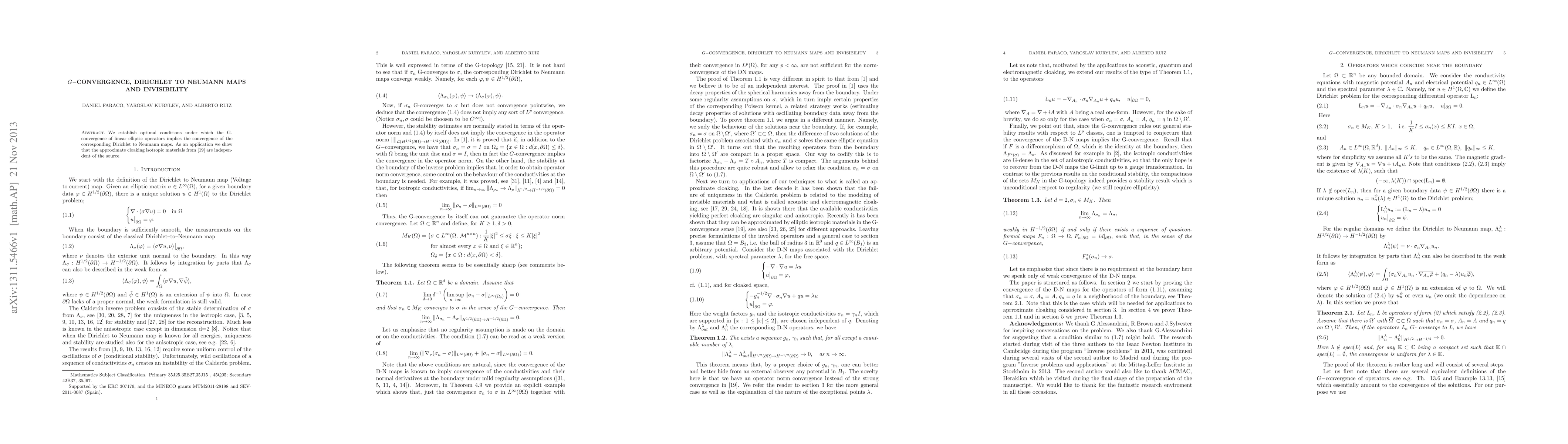 Summary: This paper determines the optimal conditions for G-convergence of linear elliptic operators that ensure convergence of Dirichlet to Neumann maps, and demonstrates that approximate cloaking materials' invisibility properties are independent of the source.