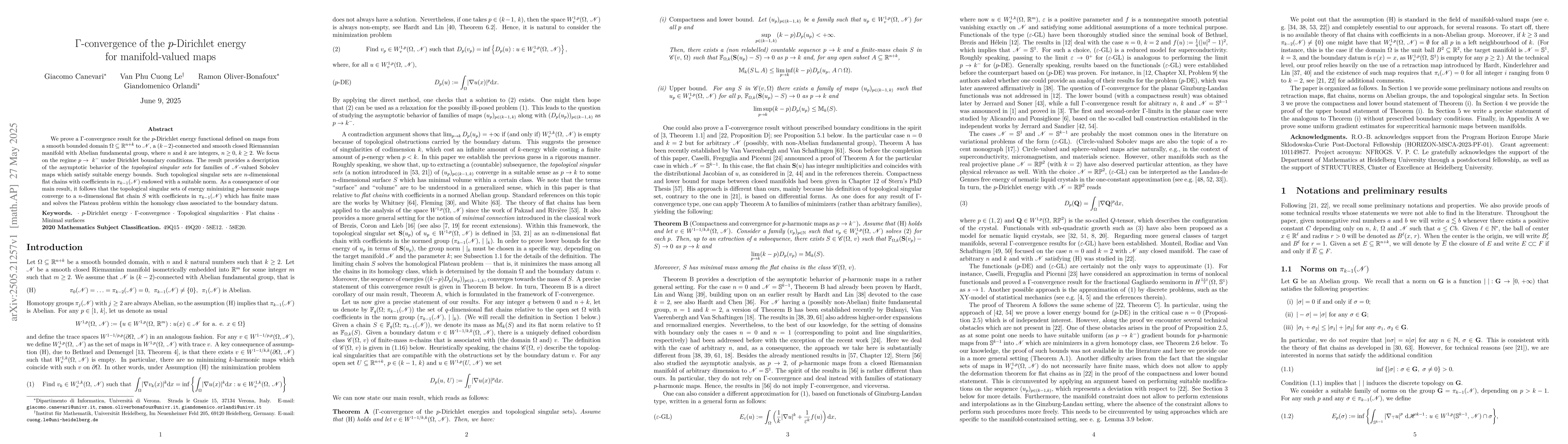 The paper establishes a ${\Gamma}$-convergence theorem for $p$-Dirichlet energy of manifold-valued maps, describing the topological singular sets and their convergence properties.