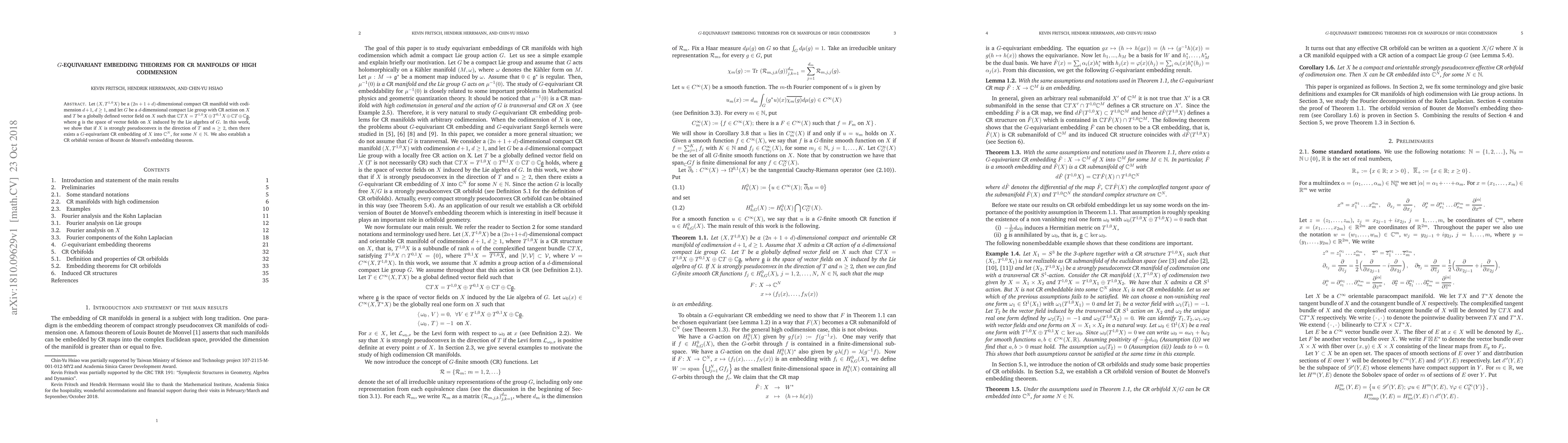 This research establishes $G$-equivariant embedding theorems for strongly pseudoconvex CR manifolds of high codimension, demonstrating their embeddability into $\mathbb C^N$ under certain conditions, and extends Boutet de Monvel's embedding theorem to a CR orbifold context.