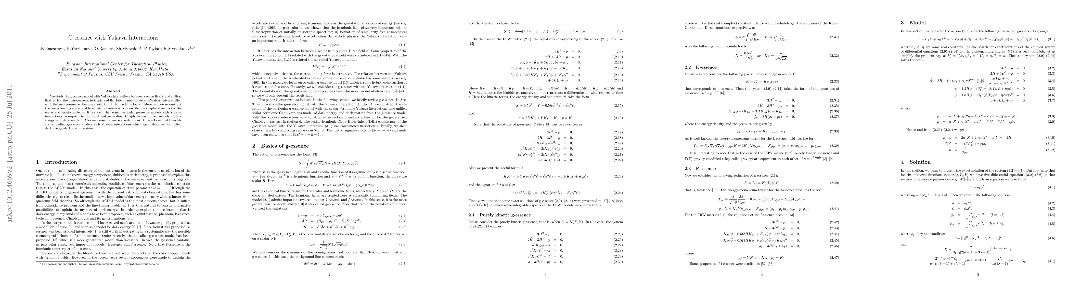This paper explores the g-essence model incorporating Yukawa interactions between a scalar field and a Dirac field, deriving an exact solution for a homogeneous, isotropic universe. It reconstructs scalar and fermionic potentials, revealing connections to Chaplygin gas models and scalar-fermionic Dirac-Born-Infeld models that describe unified dark energy-dark matter systems.