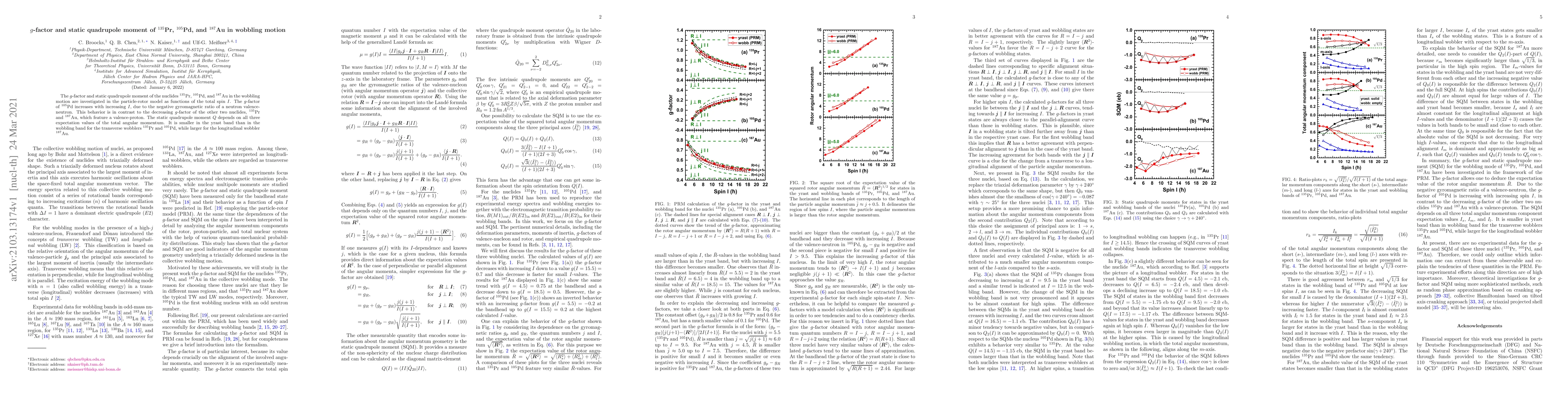 The paper presents a detailed analysis of $g$-factor and SQM in wobbling motion using the particle-rotor model, providing expressions for $g$-factor dependent on $I$, $j$, and $\langle R^2 \rangle$, and offering insights into the angular momentum geometry of the studied nuclei.